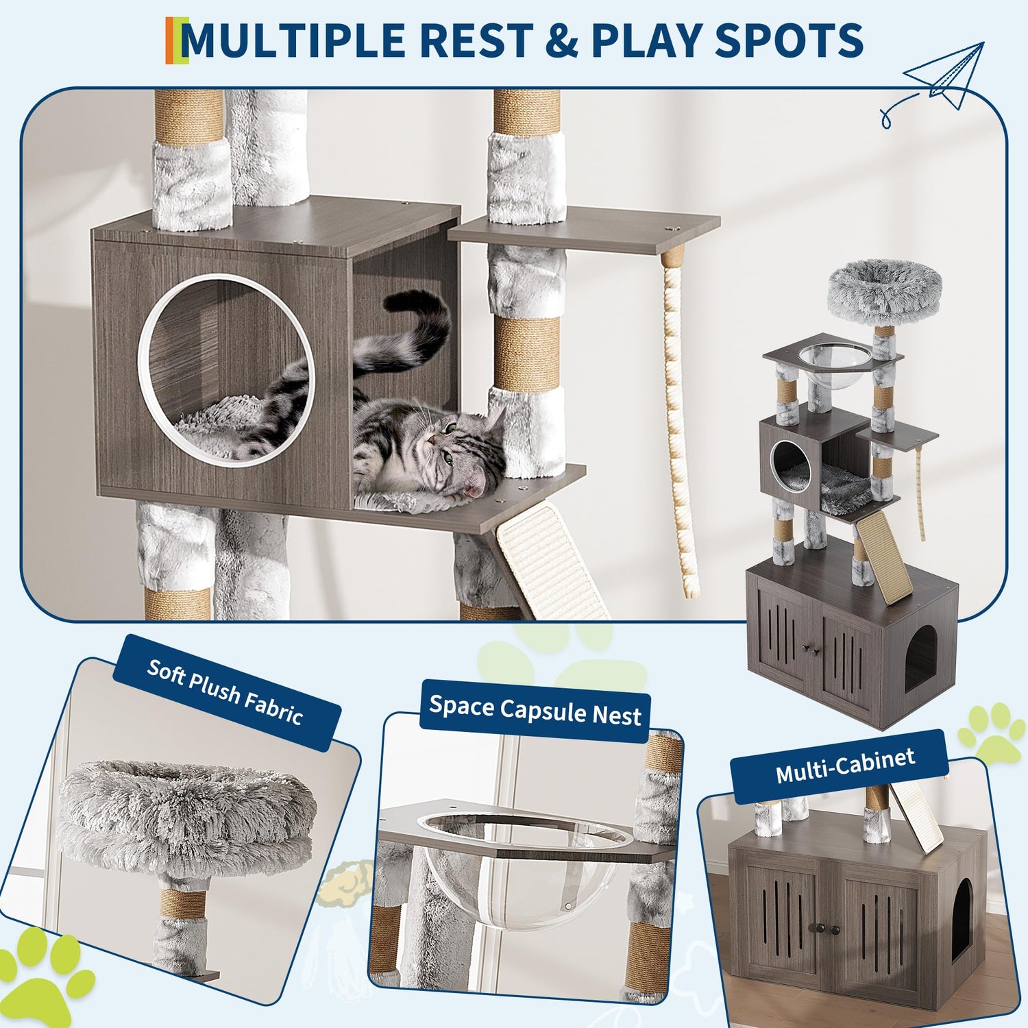 - Unique Cat Nest Design:Our cat tree with litter box enclosure built with luxurious top plush cat nest and extravagant space capsule design, brings more joy to the cat baby and better decoration for our family
