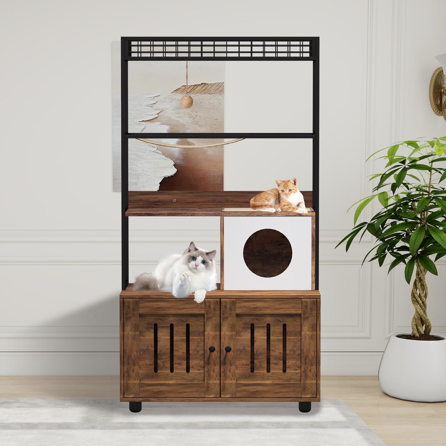 - Multifunctional Cat House: More than a hidden cat washroom, this cat litter box enclosure doubles as a cozy cat house, featuring a sisal hammock, scratch mat, condo, and a playful ball to create an engaging environment for your cat to relax, play, explore