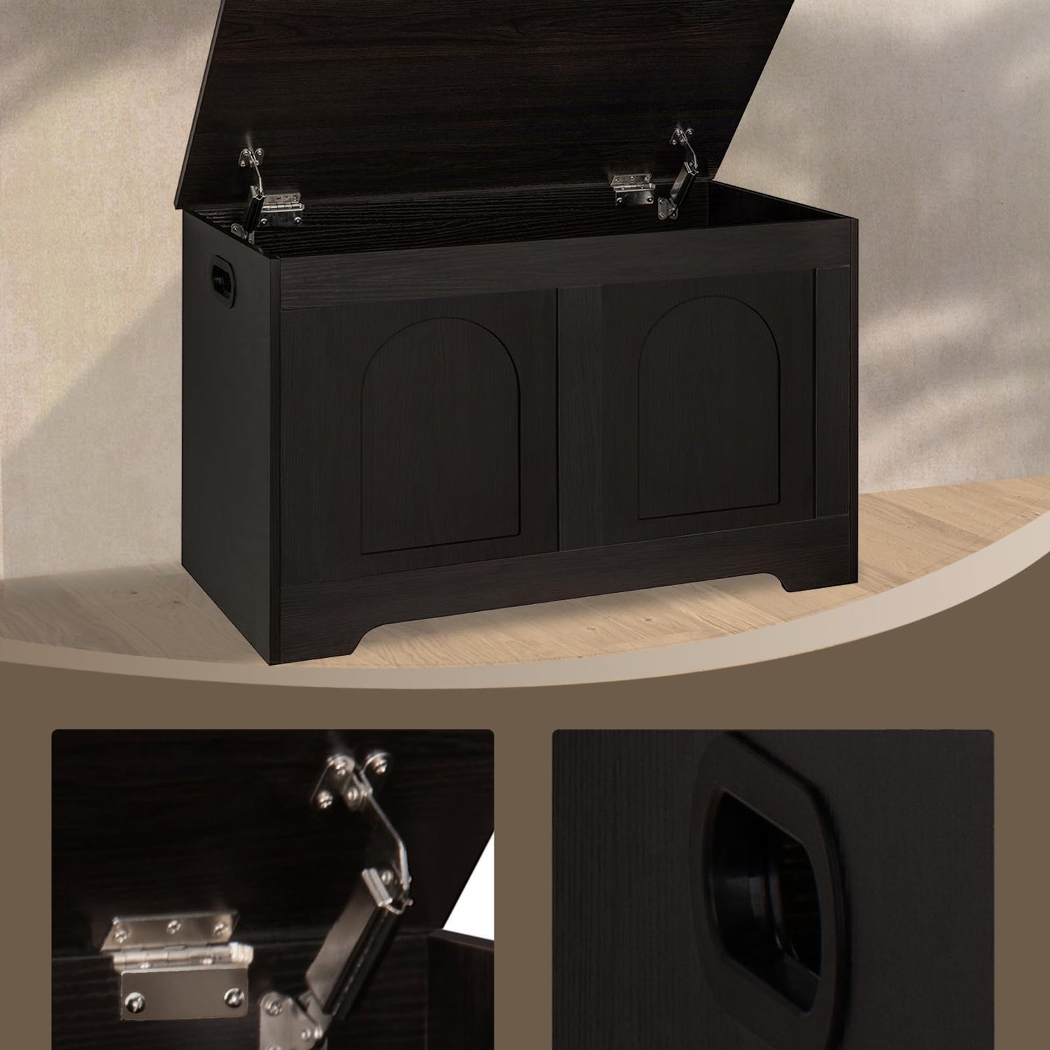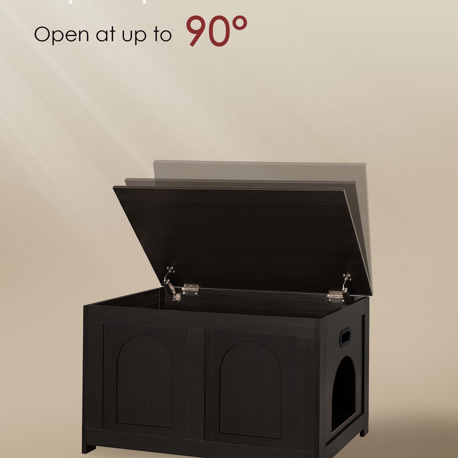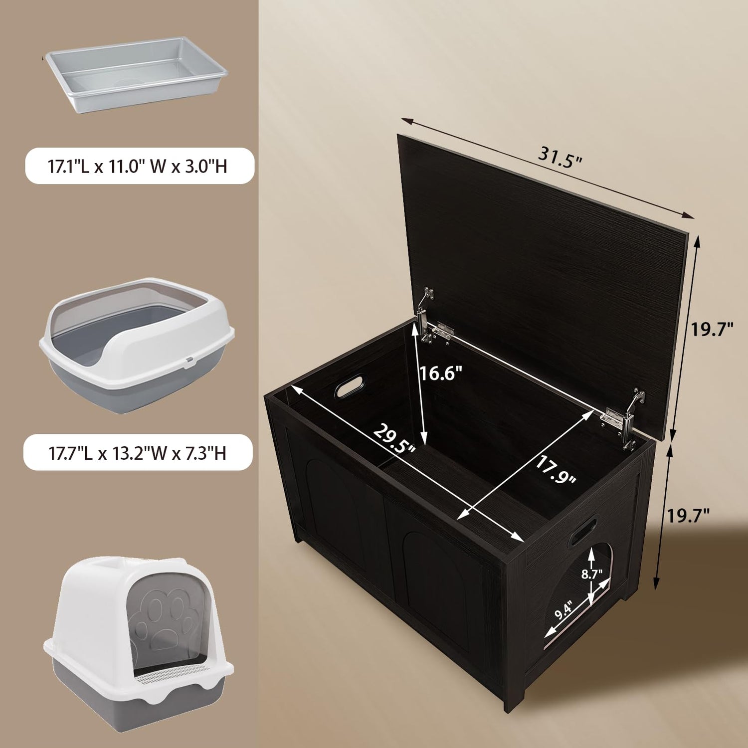 • 【Sturdy, Great Capacity】The enclosed litter box is crafted from top-notch engineered wood. Features 2 safety hinges, holding the top lid open and close slowly and smoothly. Spacious wooden litter box with a large cat entrance fits most common litter boxes. Dimension: 31.5"L x 19.7"W x 19.7"H