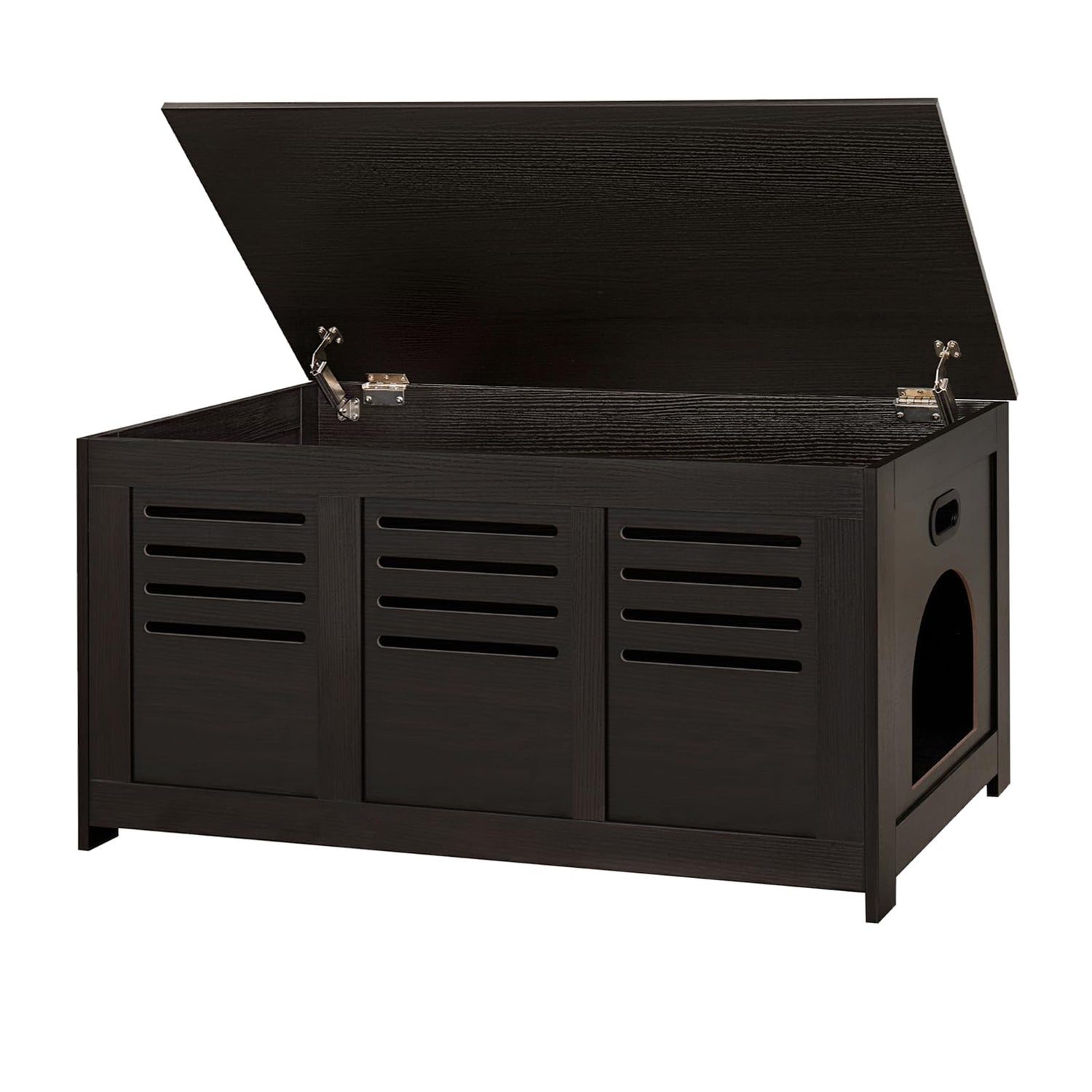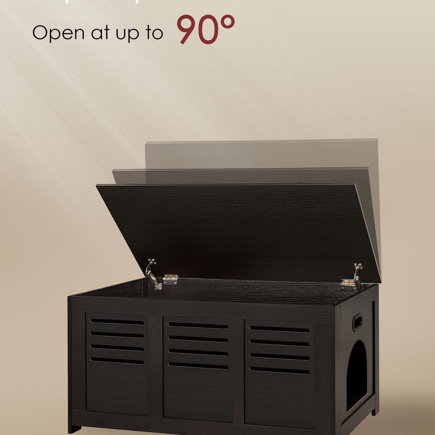 • 【Entrance Can Be on Left or Right】For the convenience of you and your cat, we have carefully designed a reversible entrance for the litter box enclosure, which can be entered from left or right. Flip top lid is equipped with 2 safety hinges, holding the lid open and close slowly and smoothly