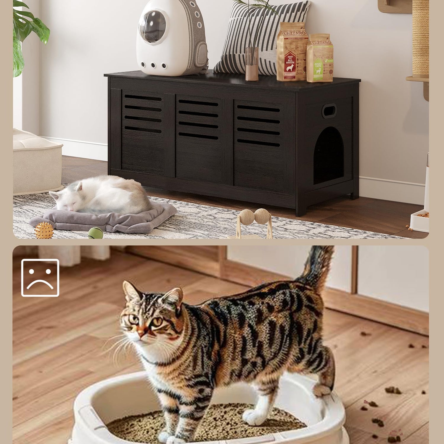 • 【More Privacy, More Love】Cats are independent and also need some private space. The sturdy and stylish cat box cabinet allows your cat to find a sense of security and belonging in a comfortable environment. The litter box enclosure will save you from the trouble of scattered litter and pervaded smell