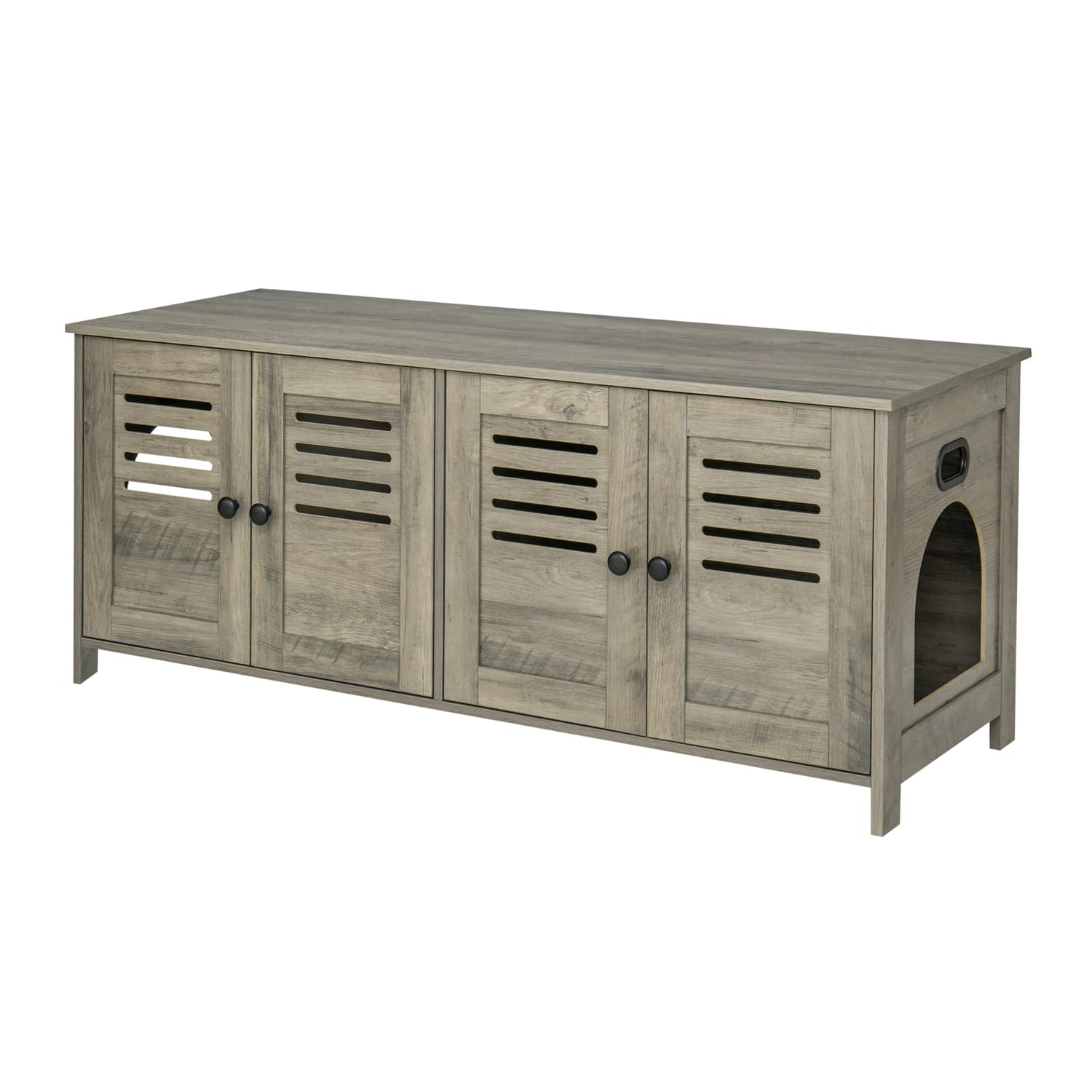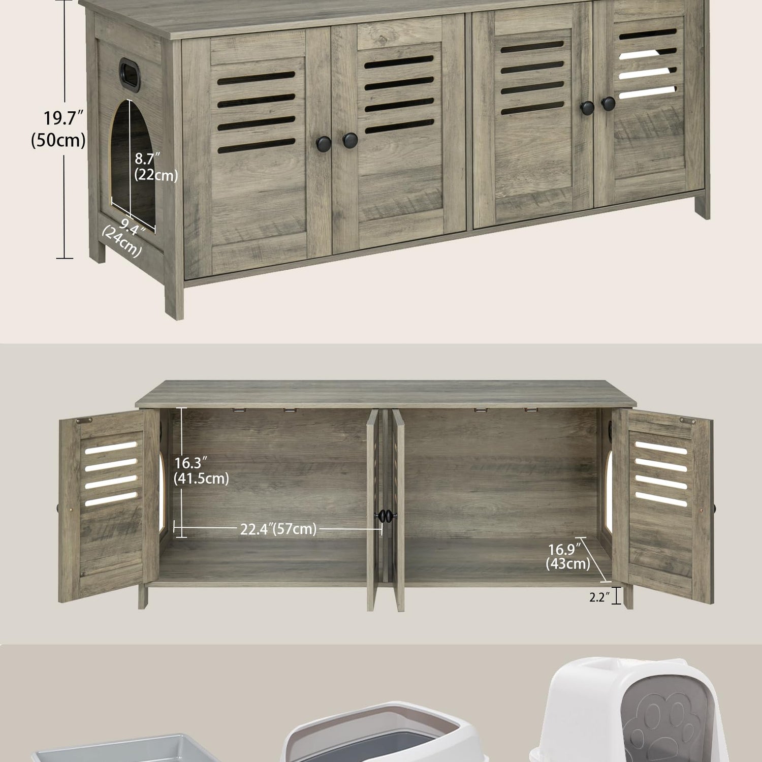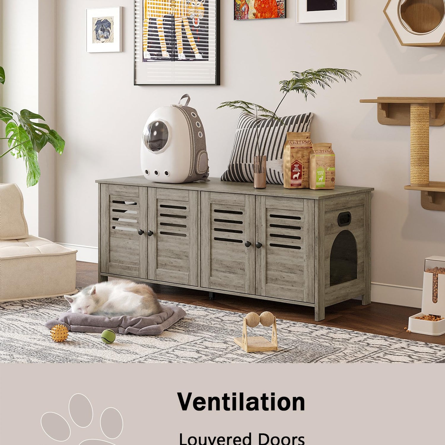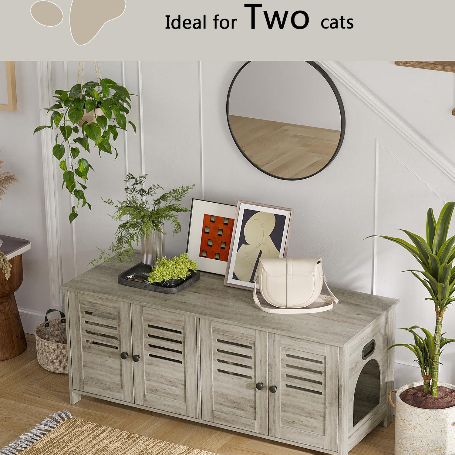 DINZI LVJ Litter Box Enclosure for 2 Cats, Hidden Litter Box Furniture with Double Rooms, Dual Cat Litter House, Front Doors, 47.2" Wooden Hidden Cat Washroom, Side End Table, TV Stand, Gray Wash