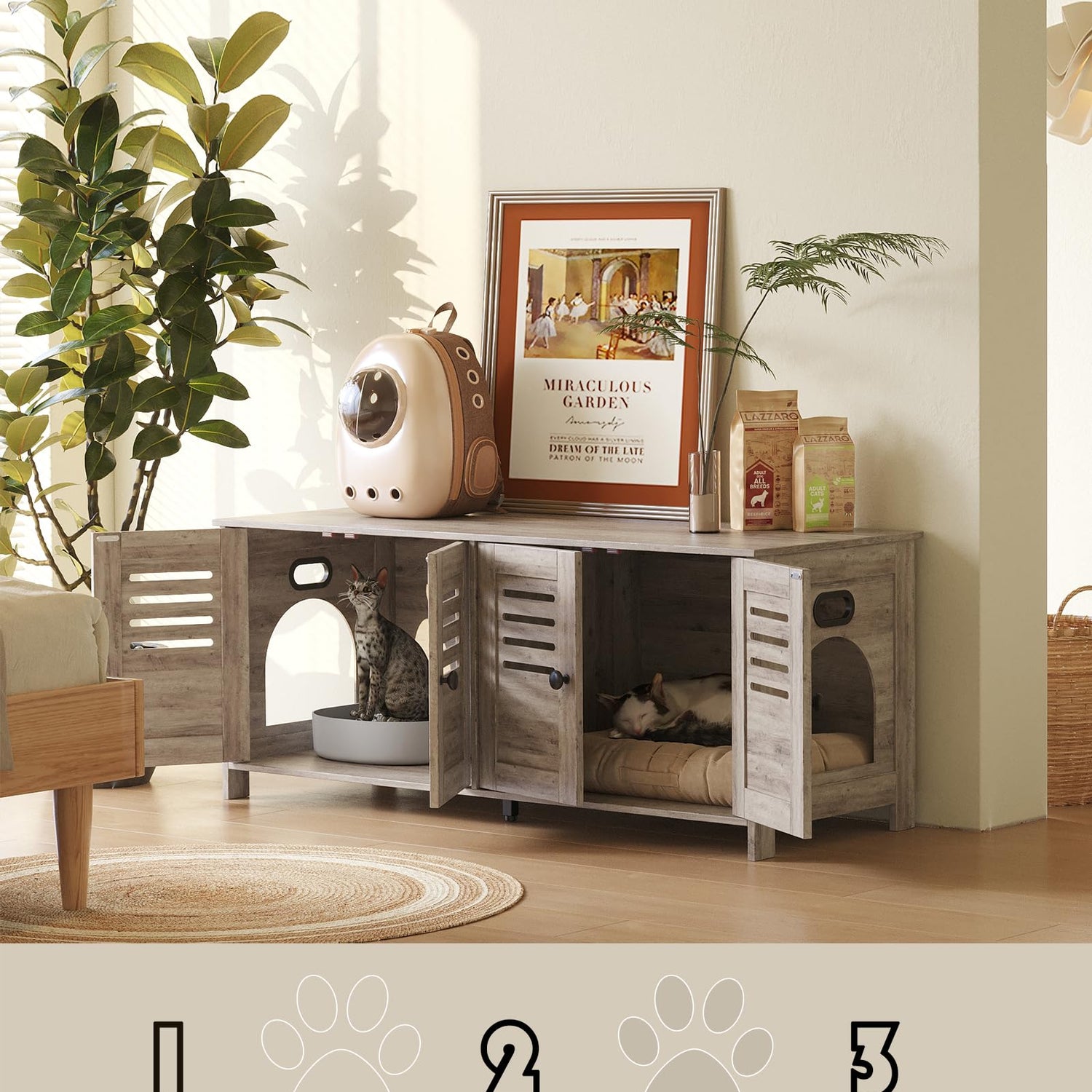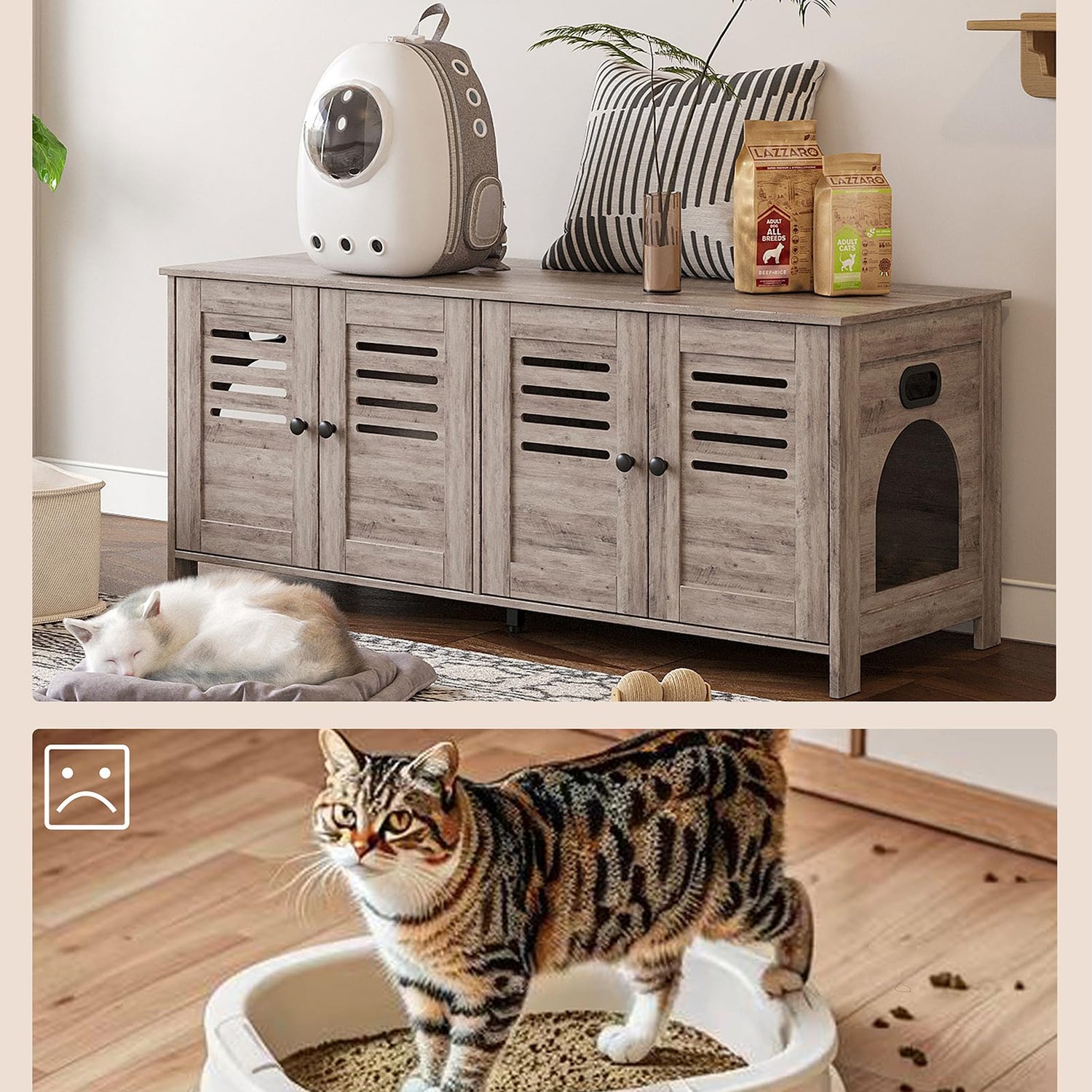 - 【All-in-1 Pet Furniture】As a litter box enclosure, it perfectly hides odors and scattered cat litter. As a cat house, it provides your cats a private and secure place. It can also be used as a storage cabinet to store cat supplies. Spacious top space can be used as a side table or TV stand