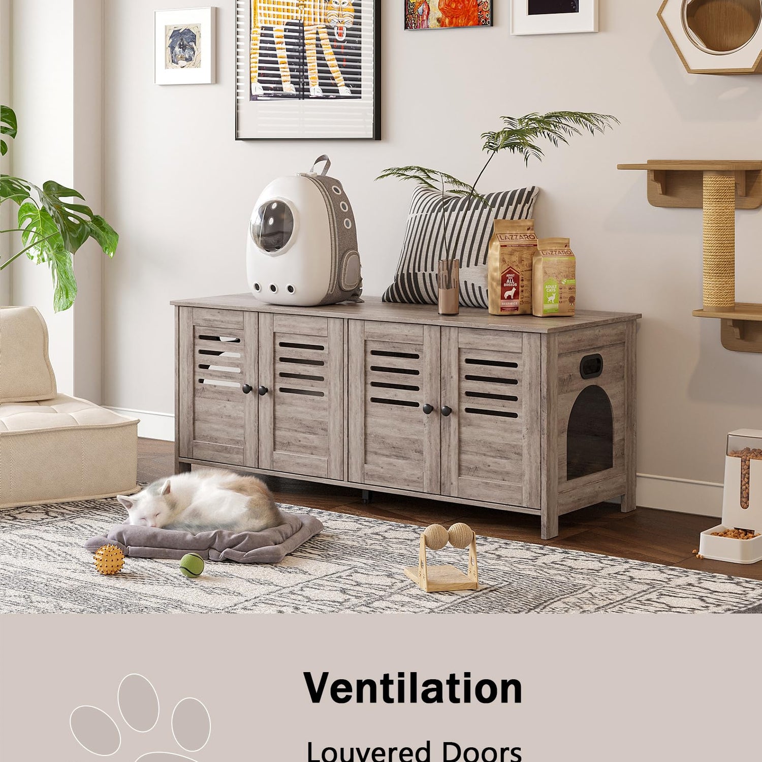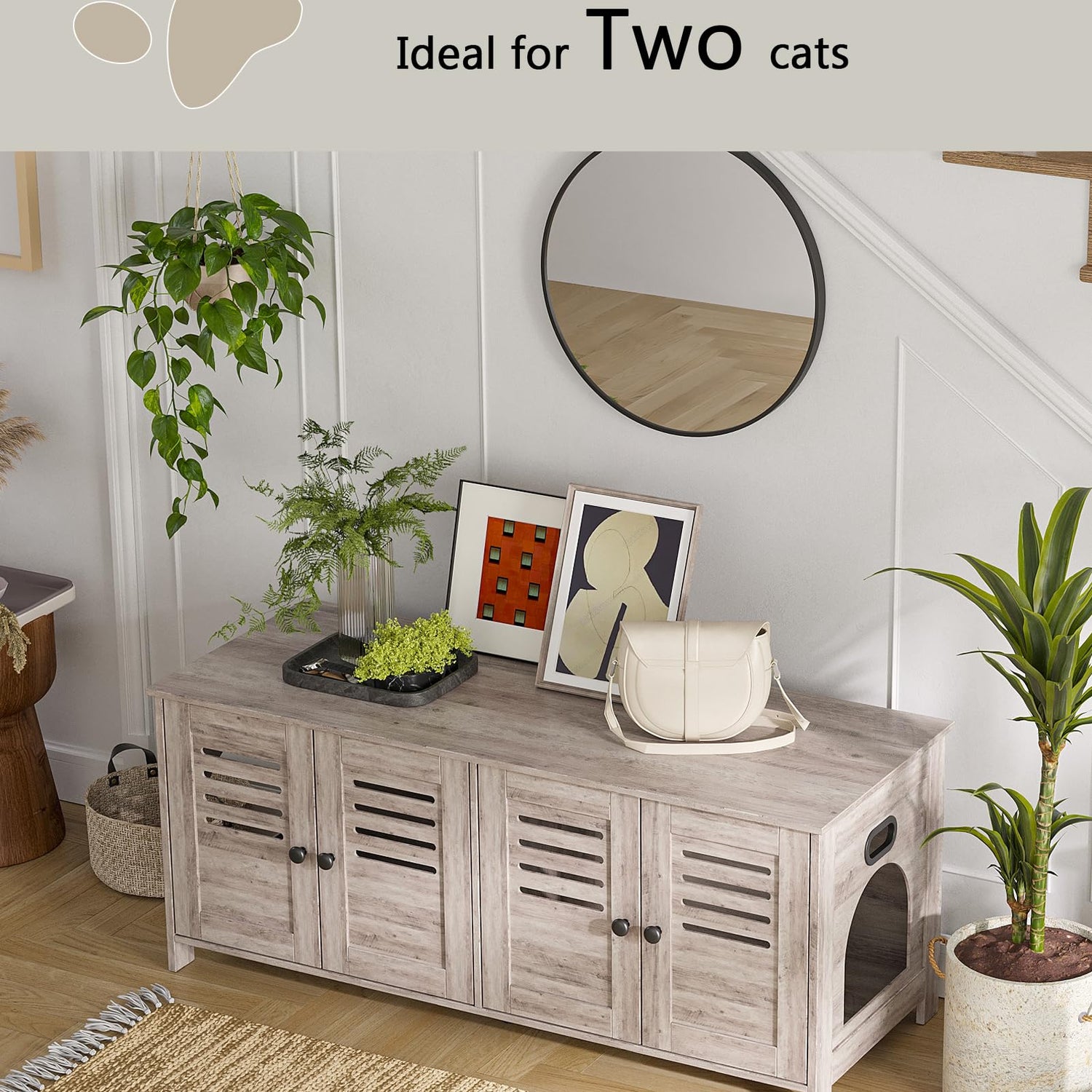 DINZI LVJ Litter Box Enclosure for 2 Cats, Hidden Litter Box Furniture with Double Rooms, Dual Cat Litter House, Front Doors, 47.2" Wooden Hidden Cat Washroom, Side End Table, TV Stand, Greige