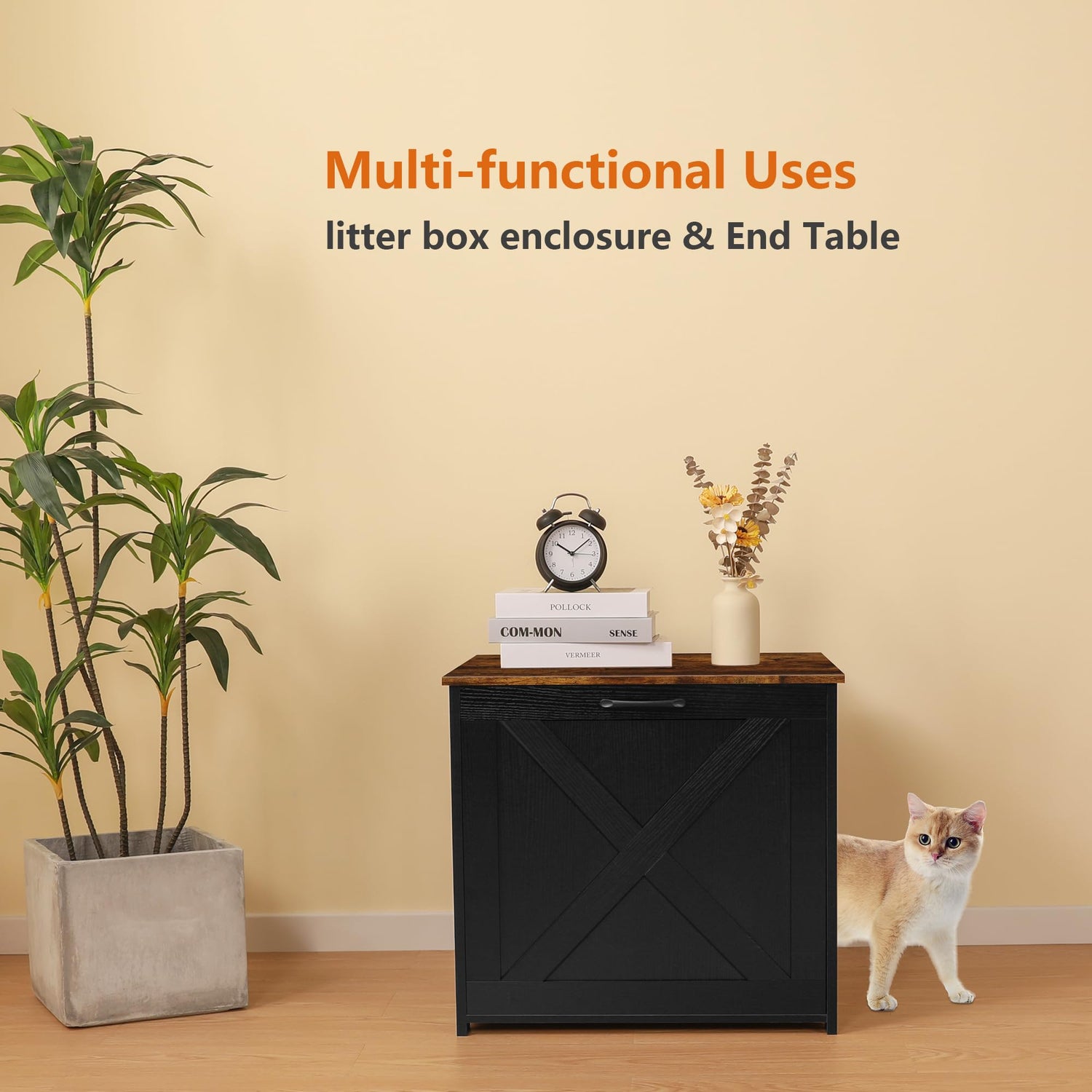 - 【Furniture style for more usage】The patchwork design of black cabinet and rustic brown table top matches perfectly with the decor of your home. It is not only a cat litter box enclosure, but also can be used as a cat house . Meantime, you can use this furniture as an end table or coffee table next to the sofa because of its' fashionable furniture style.