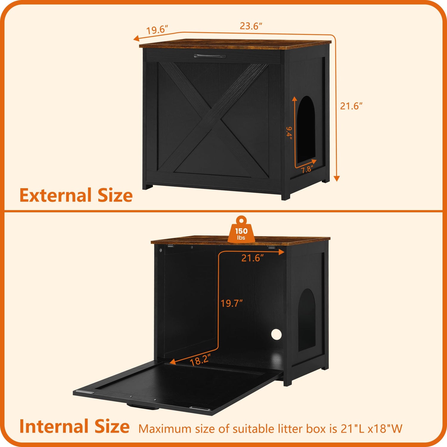 - 【SIZE】: External: 23.6 x 19.7 x 21.7 inches ; Interior Usable Dimensions: 21.6 x 18.2 x 19.7 inches ,please measure to fit your litter box.