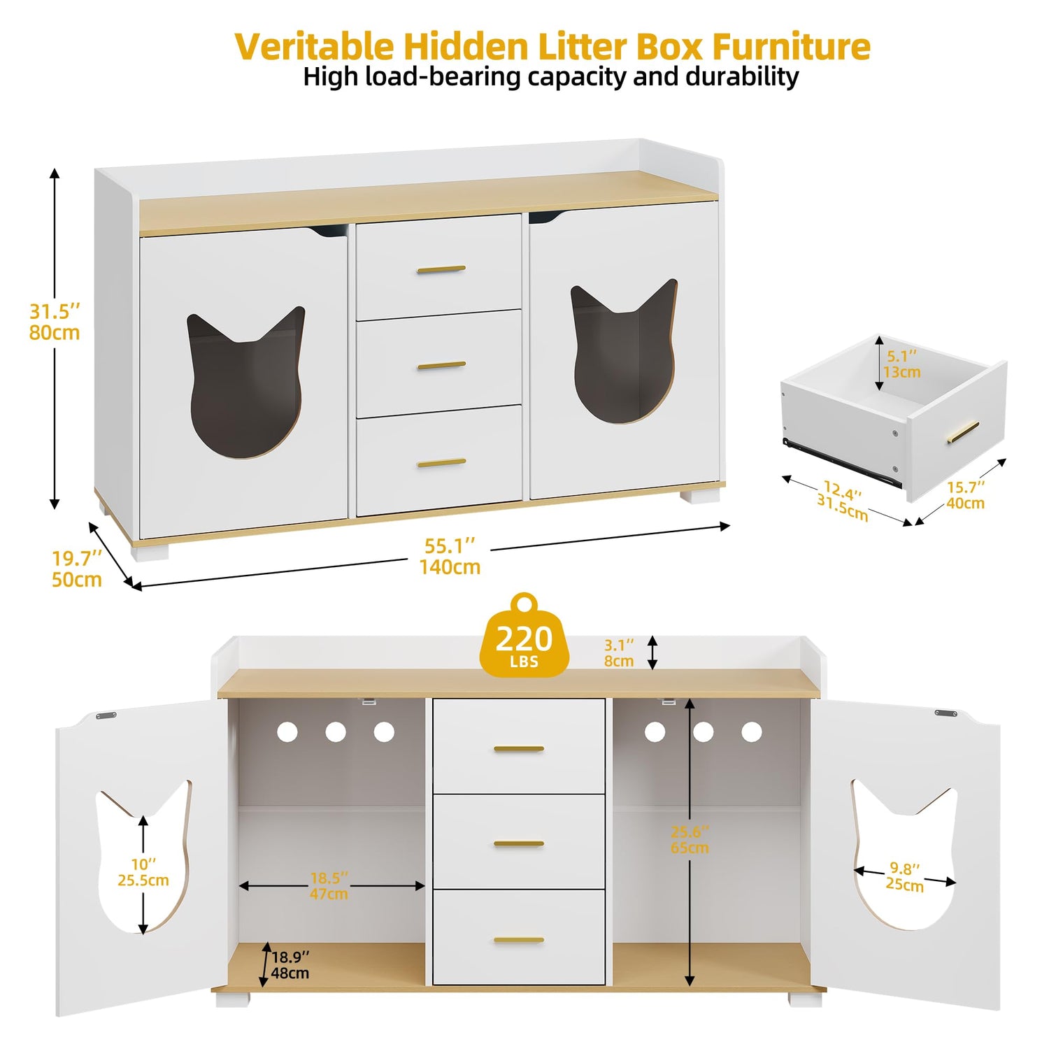 - Veritable Hidden litter box furniture - With overall dimensions of 55"L x 19.7"W x 31.5"H, DWVO cat litter box enclosure adopts fashionable white-gold color scheme and cute cat door design, realizing the clever fusion of storage cabinet and litter box enclosure, provide enough private space for cats and match with most of the furniture styles