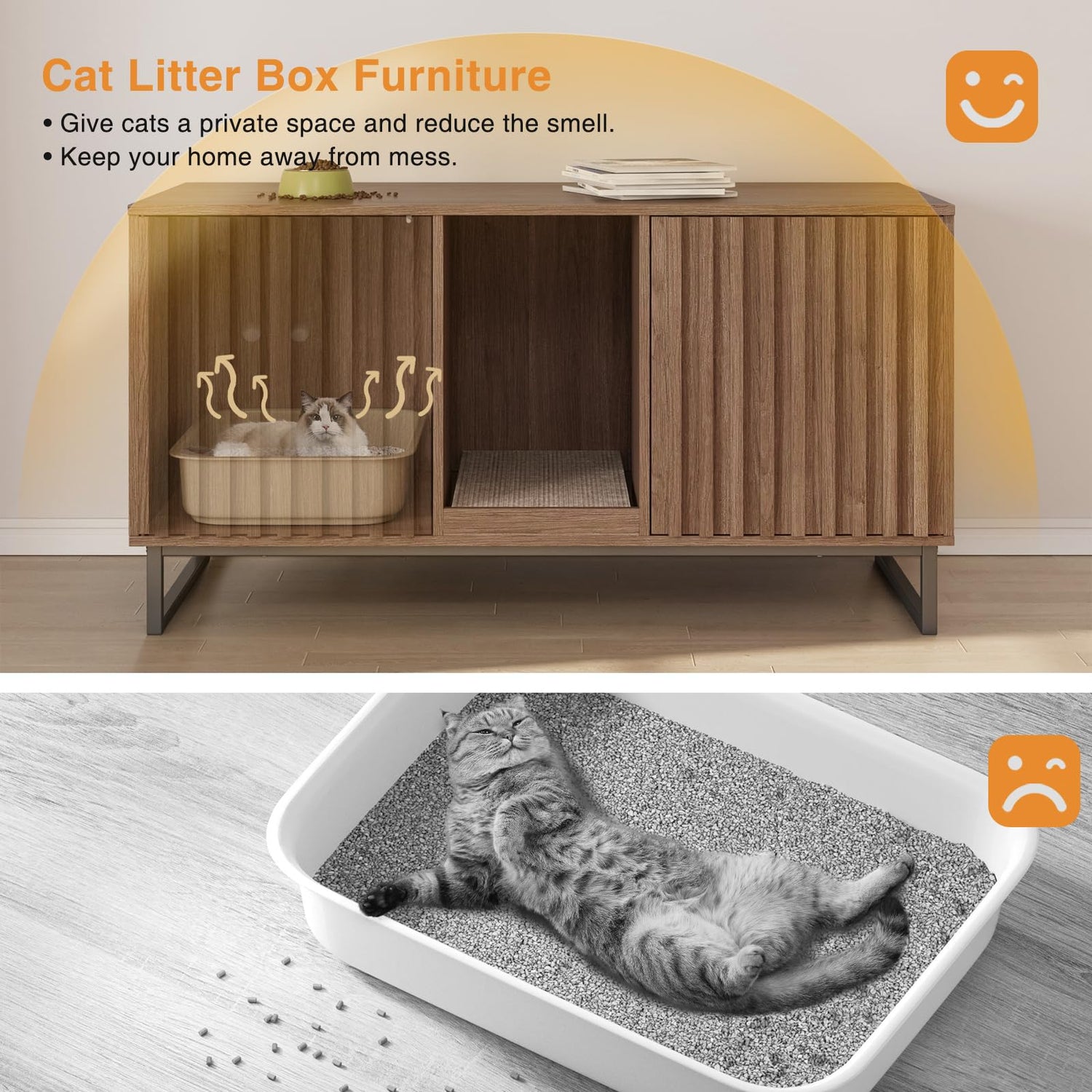 Fienveorn Cat Litter Box Enclosure for 2 Cats, 47.6’’ Litter Box Furniture Hidden with Cat Scratch Pad, Double Room Large Cat Cabinet, Indoor Cat House TV Stand Side Table,Cat Washroom,Brown