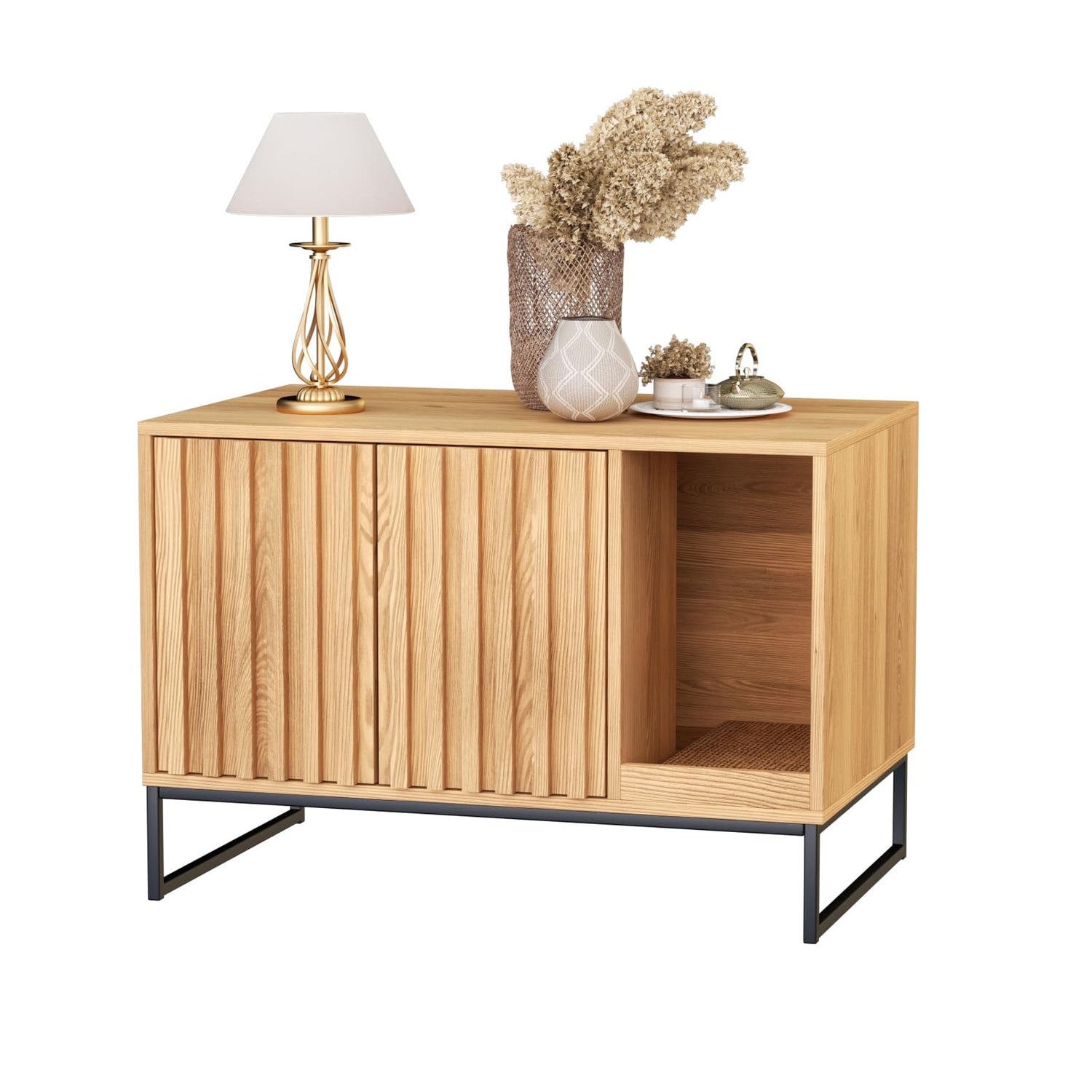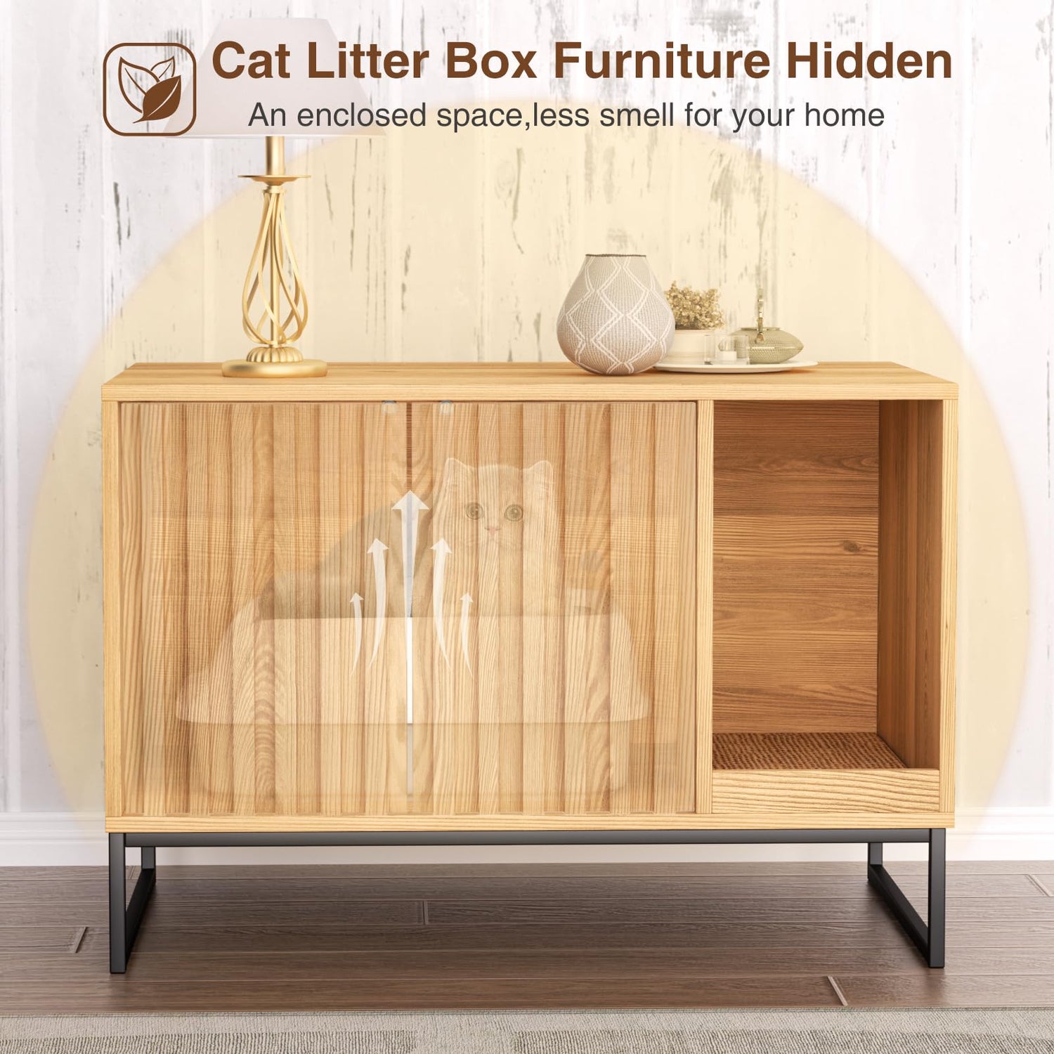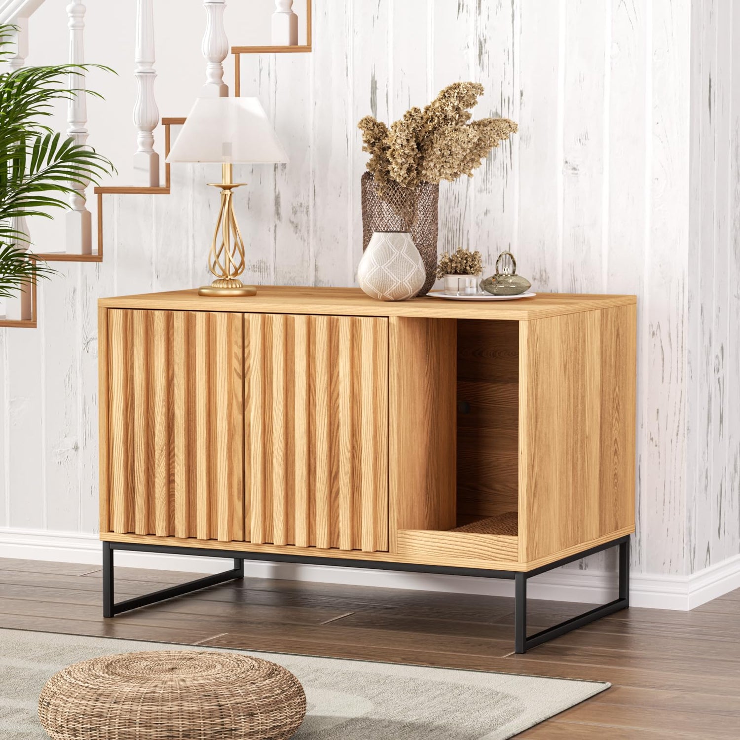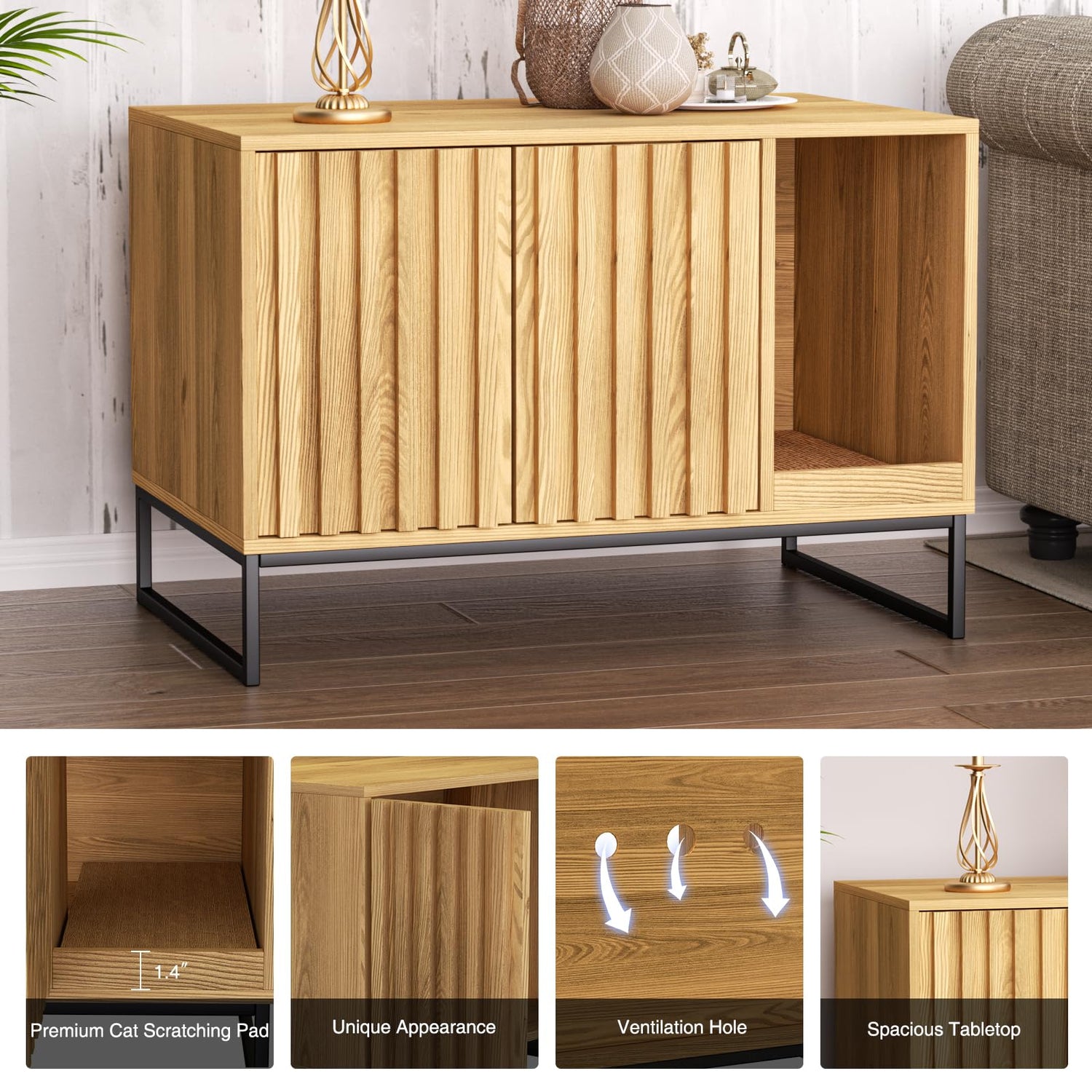 FiveWillowise Litter Box Enclosure, Modern Fluted Hidden Litter Box Furniture,Cat Litter Box Enclosure with Scratching Mat,Cat House Side End Table,Natural