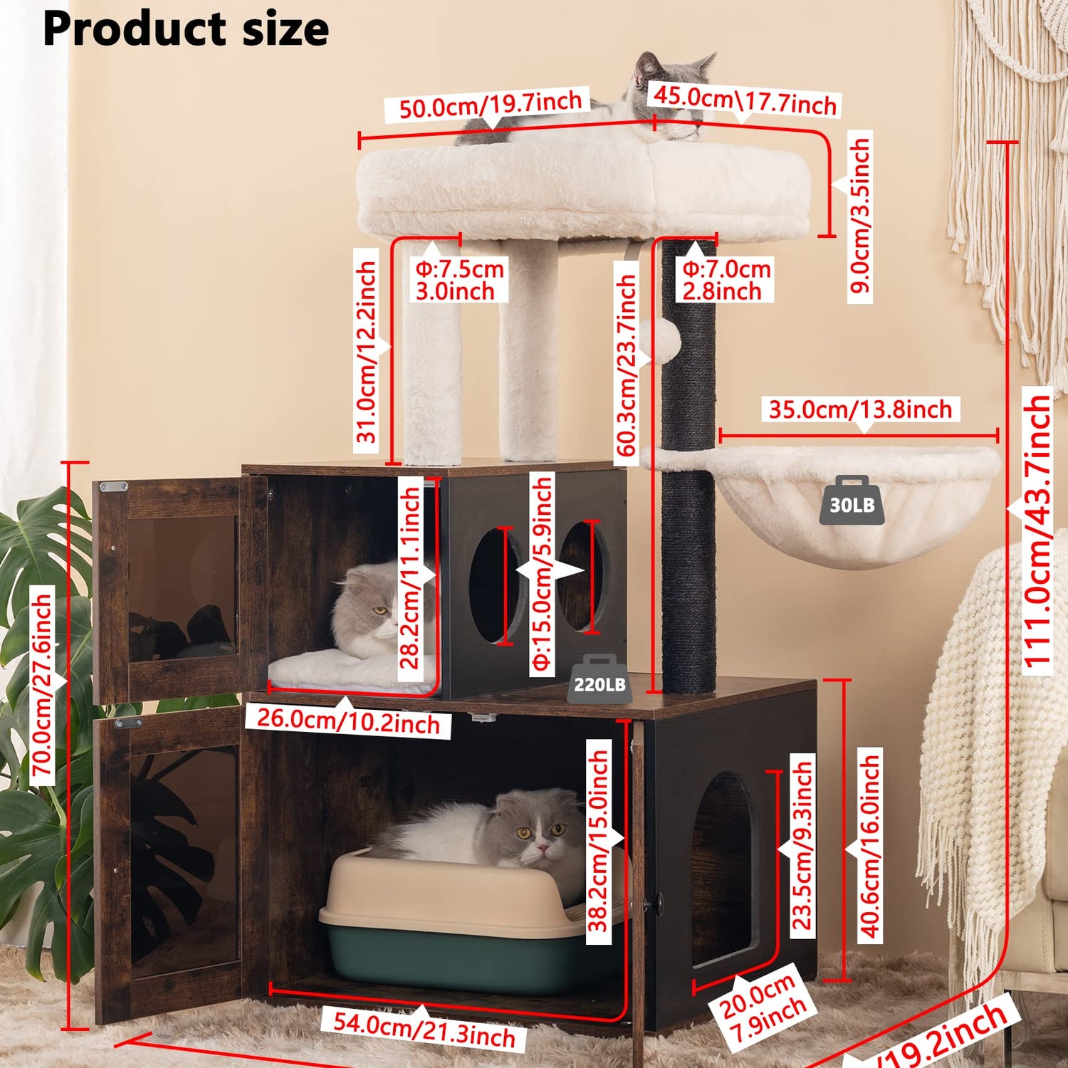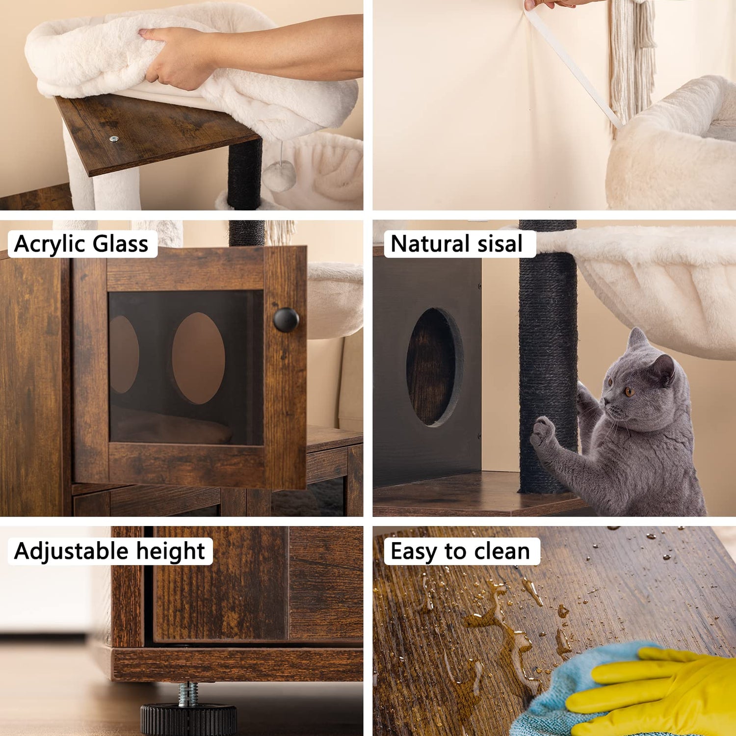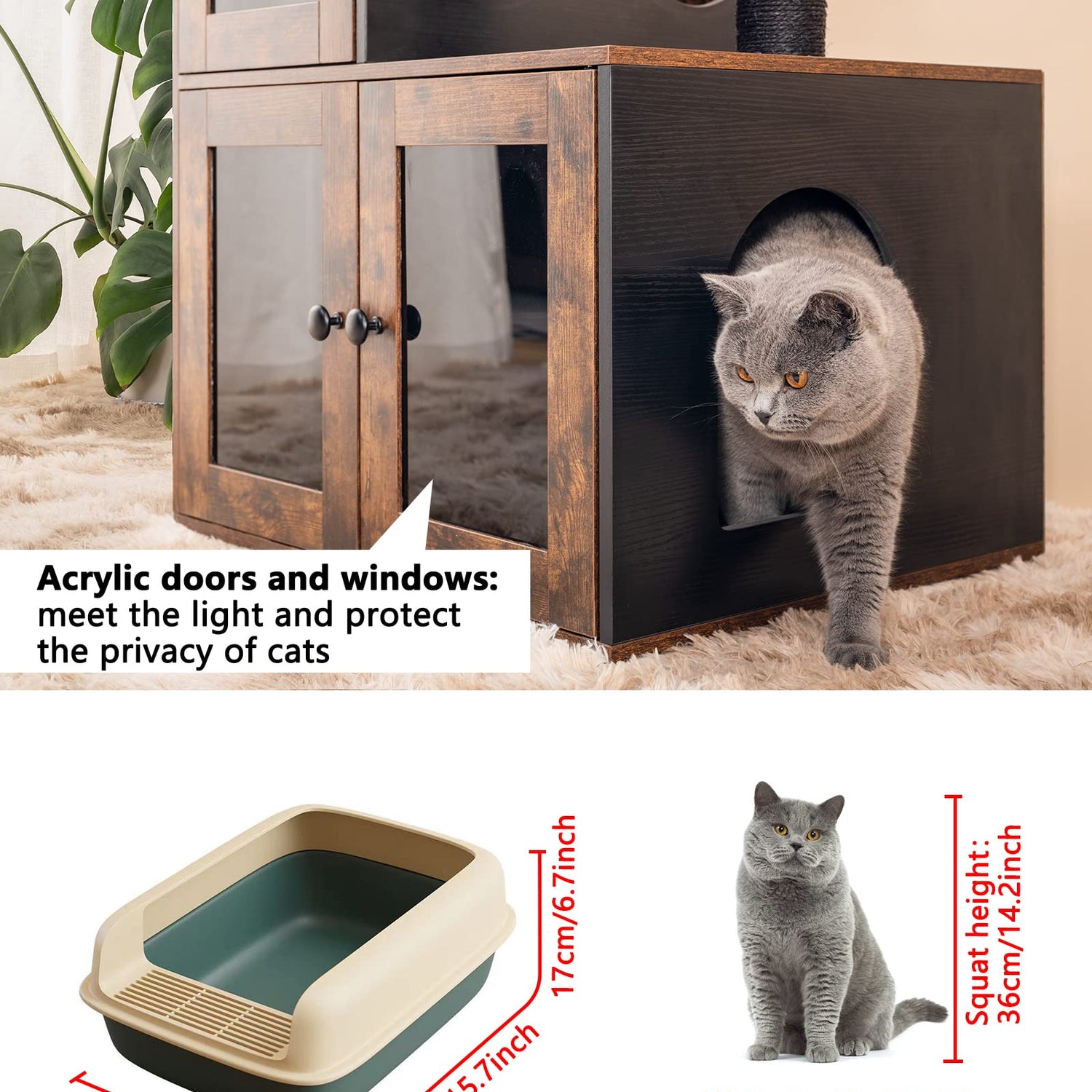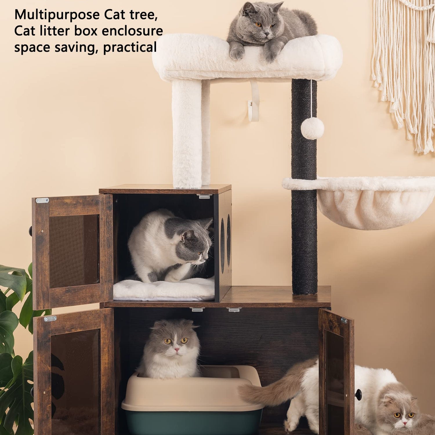 Fourfurpets Multipurpose Litter Box Enclosure with Cat Tree, Acrylic Doors and Windows, with Large Platform, Cat House, Full Sisal Posts, Removable Washable Cushion, Rustic Brown