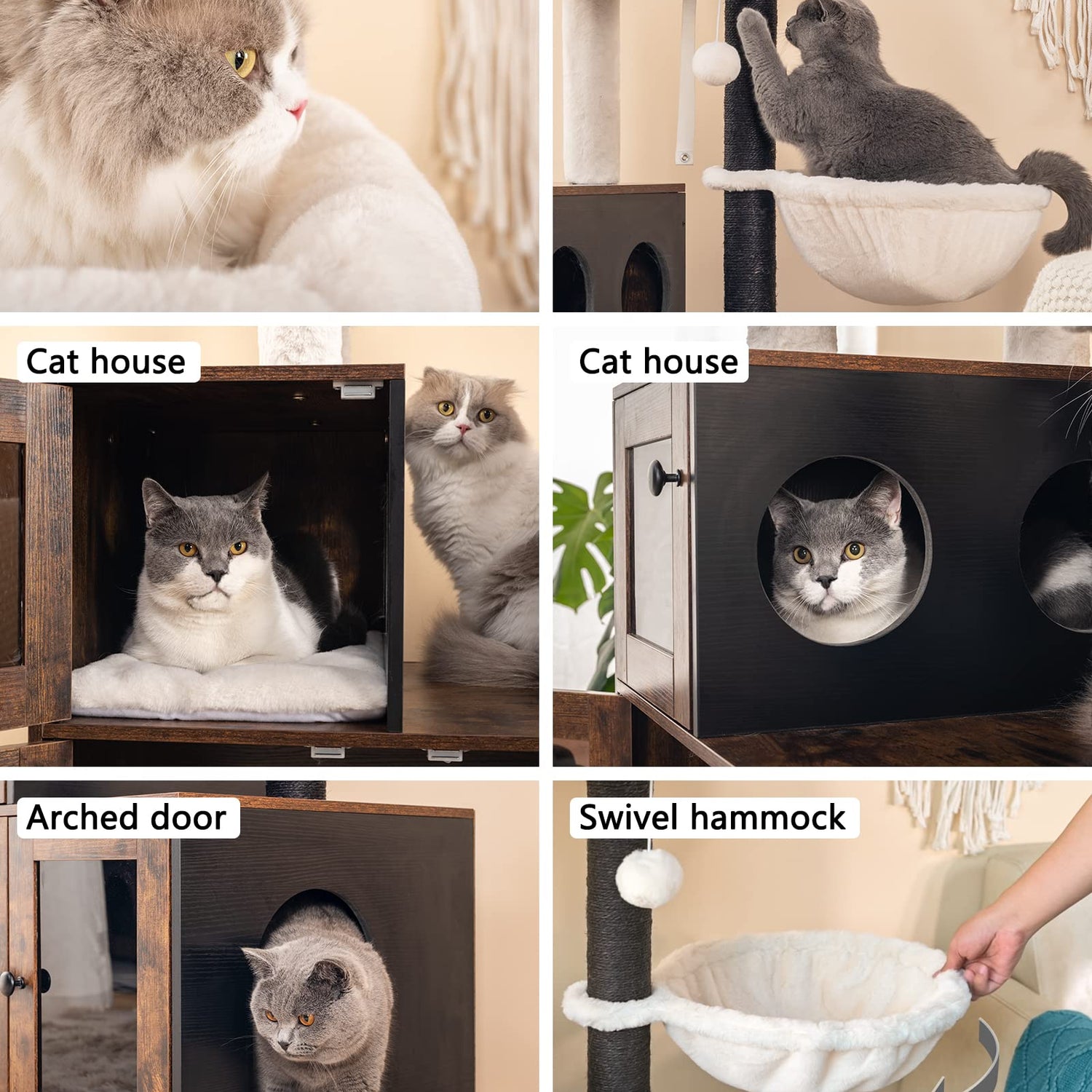 • Fourfurpets Multipurpose Litter Box Enclosure with Cat Tree and Condo, Side Table, with Large Platform, Cat House, Full Sisal Posts, Removable Washable Cushion