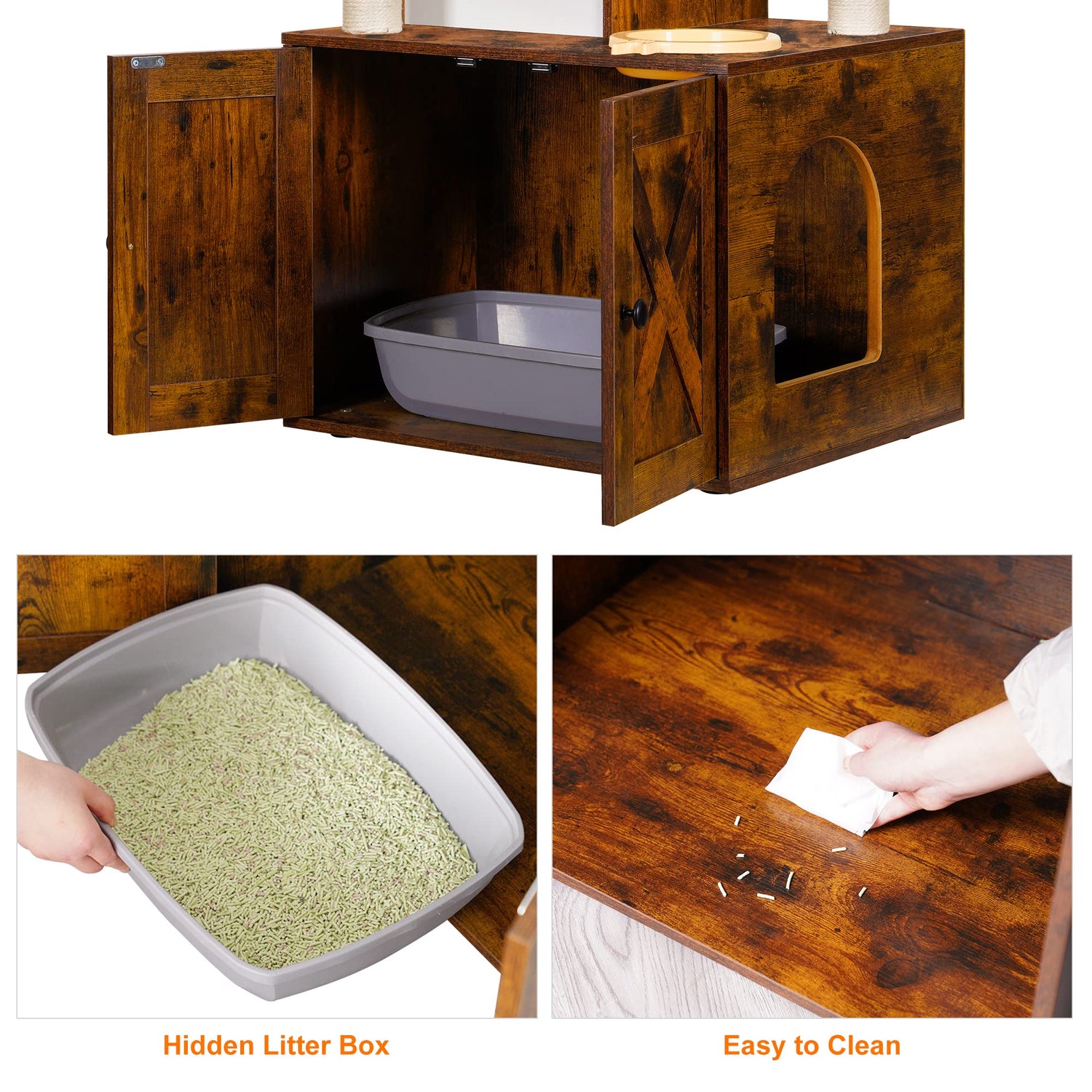 Heybly Cat tree, Wood Litter Box Enclosure with Food Station, All-in-one Indoor Cat Furniture with Large Platform and Condo, Modern Style Cat Tower, Hammock, Rustic Brown HCT102SR