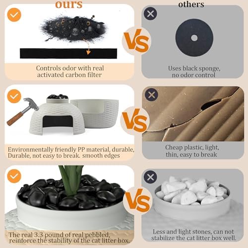 - 【Heavy Duty Polypropylene & Natural Stones】Not cheap materials, our plant litter box made of heavy duty Polypropylene, which is heavier and stronger. In addition, we add high quality stones to the top of the enclosed litter box furniture, no matter how the cat climbs and scrapes, the hidden litter box will not topple down.