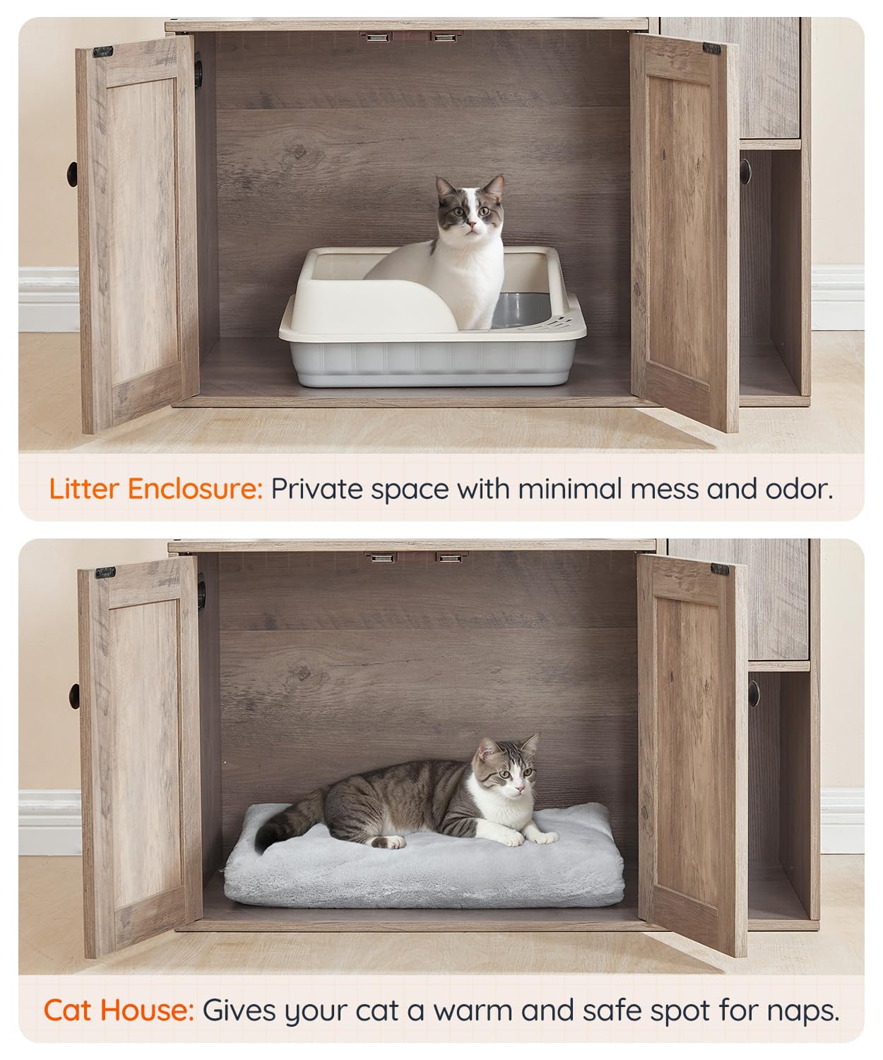 HOOBRO Cat Tree with Litter Box Enclosure, Cat Tower with Food Bowl and Storage, Hidden Cat Litter Enclosure Furniture, All-in-One Modern Cat Condo, with Cat House, Hammock and Perch, Greige BG80MZ03
