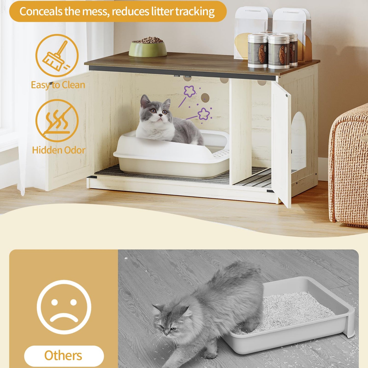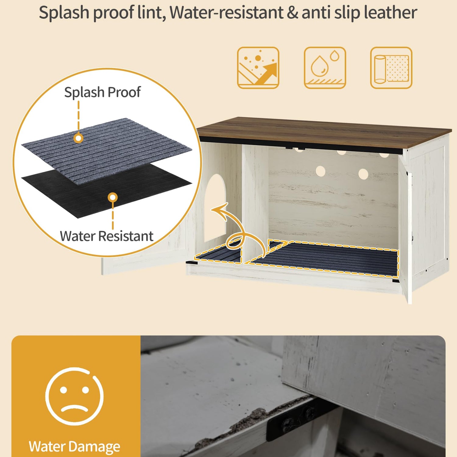 - Cat Private Space: The cat house corridor design is dog proof and ensures the privacy of cats; Moisture proof and splash proof pads prevent particle board from expanding when exposed to water, reducing cat litter splashing