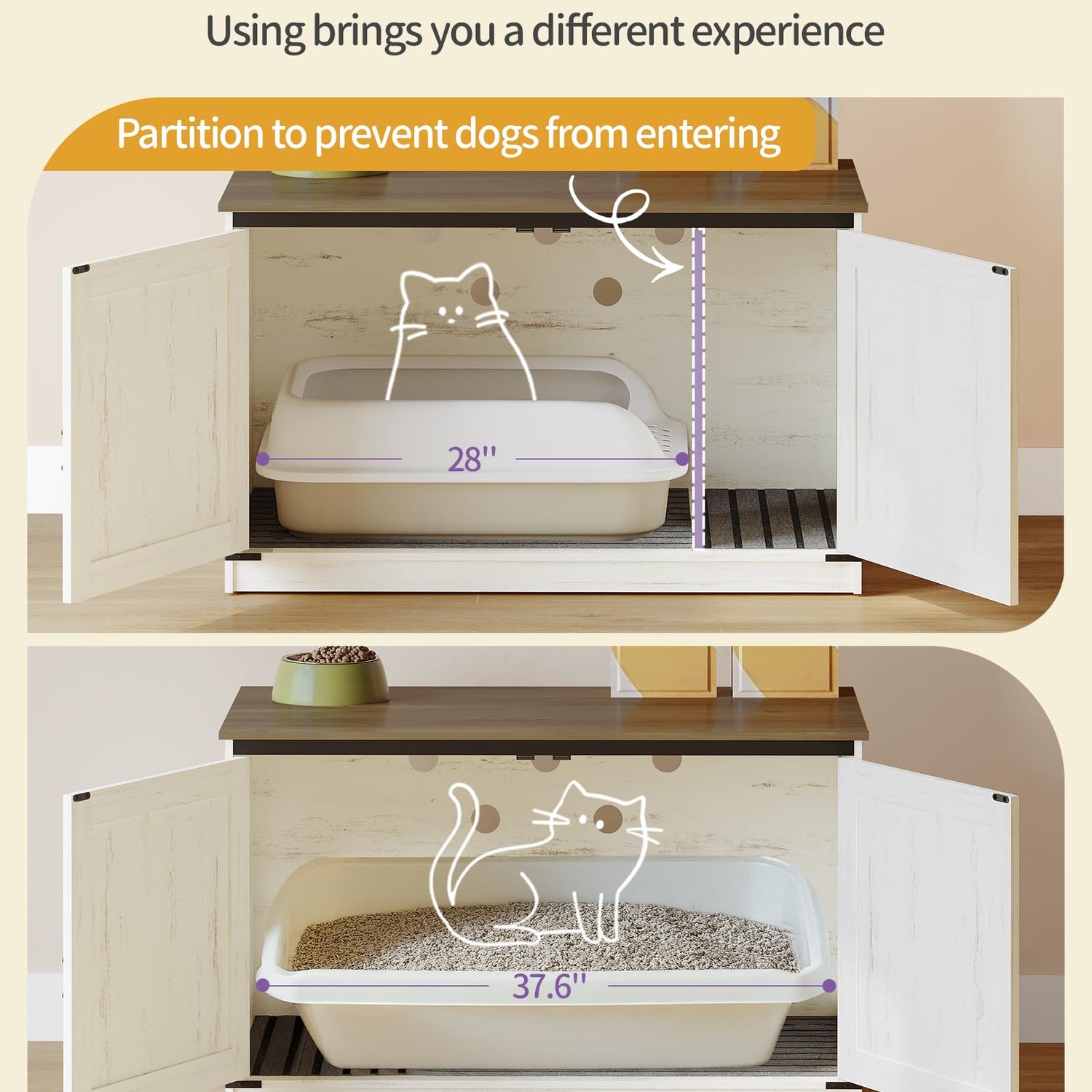 - Suitable for Large Box: When installing the hidden cat litter box furniture partition, the internal dimensions are 28"L x 19.9"W x 20.9"H; After removing the partition, the internal width increased to 37.6"L, suitable for most sizes of cat litter boxes