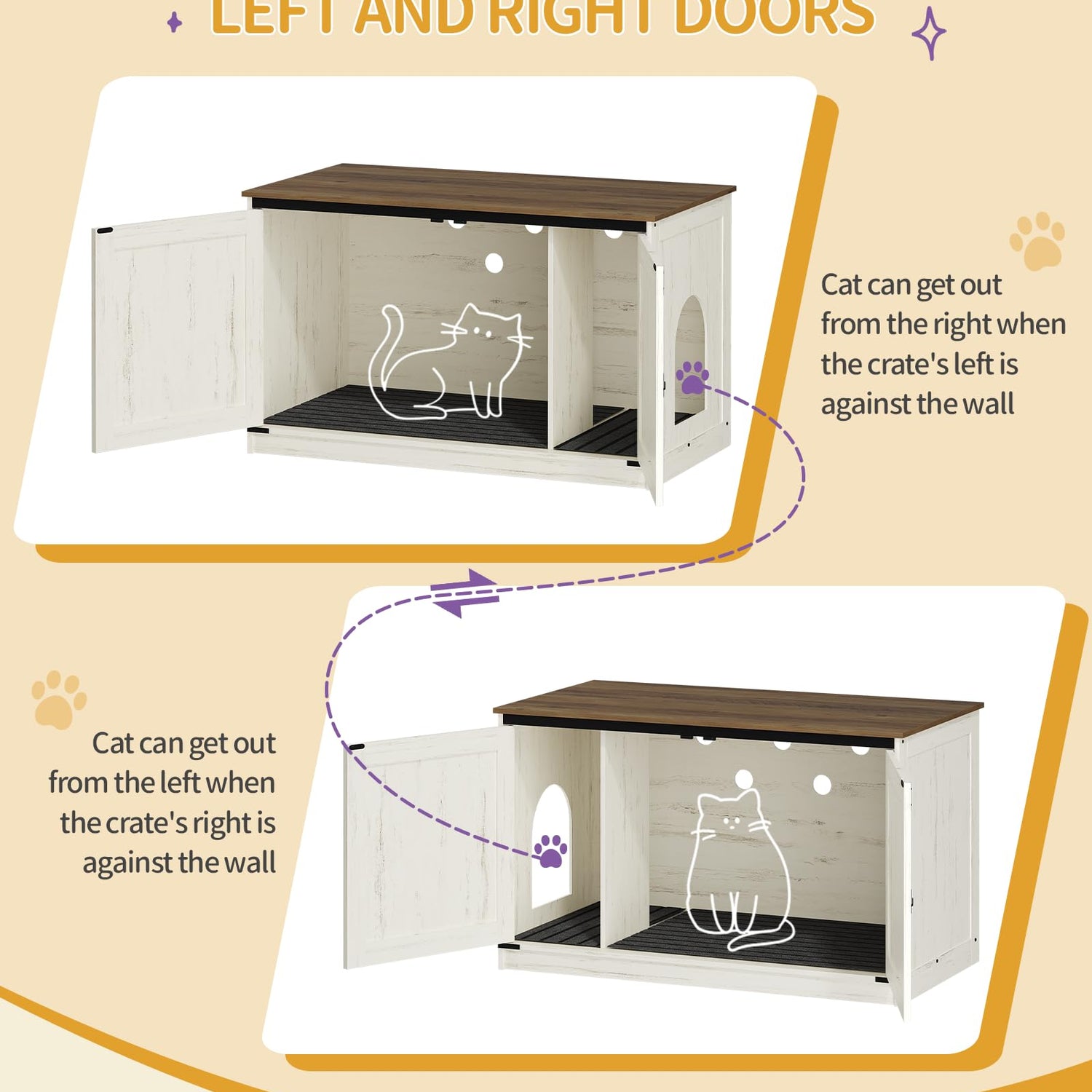 - More Thoughtful Details: When installing the cat side door, you can choose left or right to fit your space. The cat litter box front door lock can prevent being opened to ensure privacy and prevent dogs from entering