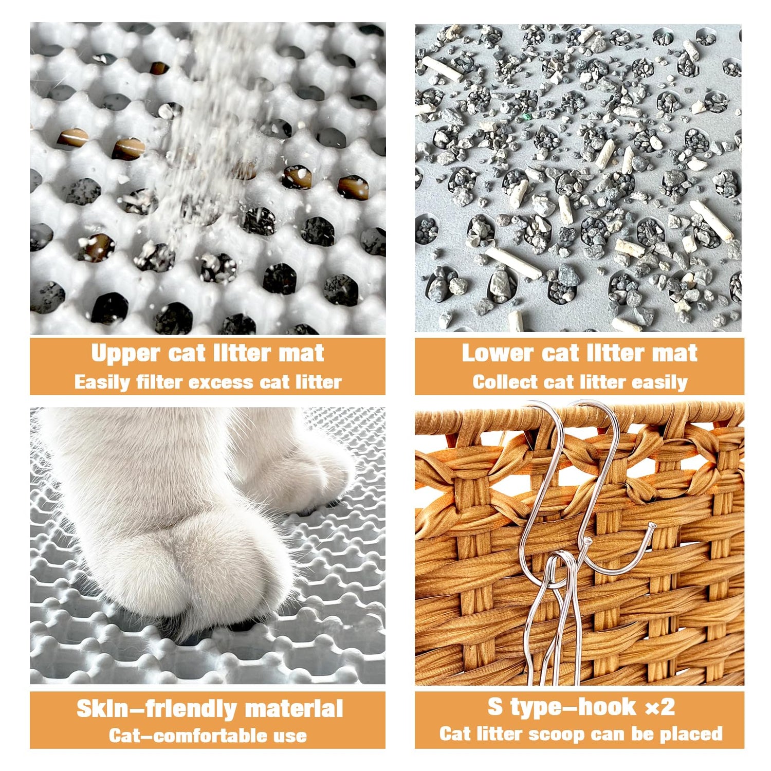 - [No burden on cat litter residue]: The cat litter box enclosure is equipped with a cat litter mat that is soft and fits the curve of the cat's feet. The upper mat has a large holes, which can easily filter large particles of cat litter, and the lower mat collects fallen cat litter. There is no litter left in the cat litter box, making cleanup a breeze.