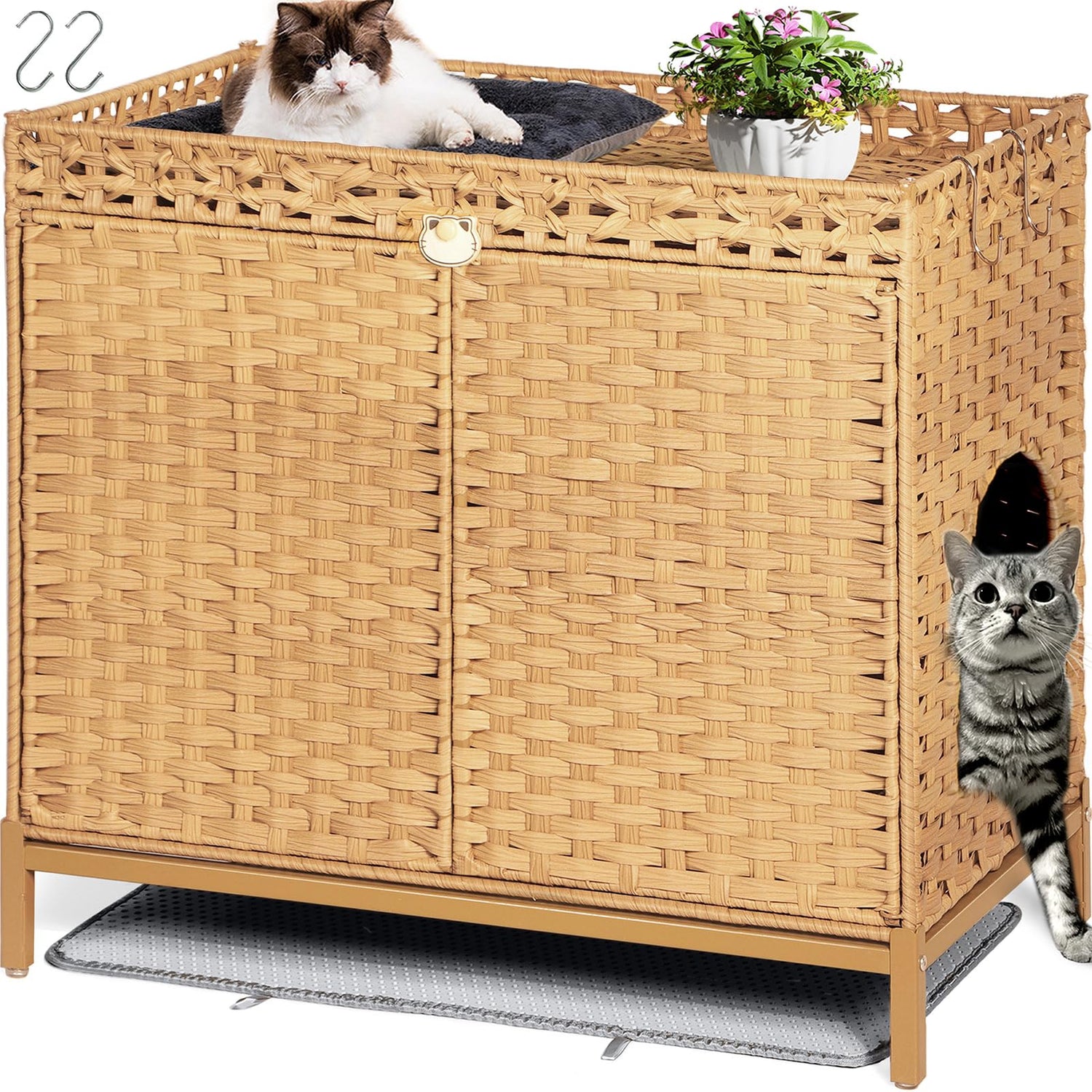 - [More comfortable environment]: The hidden cat washroom space is hand-woven from environmentally friendly, odorless rattan material, which is safe for cats to touch, and the material is not afraid of sunlight - allowing cats to enjoy a happy sun bath in their free time. The randomly woven rattan is illuminated by sunlight, which is both light-transmitting and effectively blocks disturbing odors, making your cat and you more comfortable to get along with.
