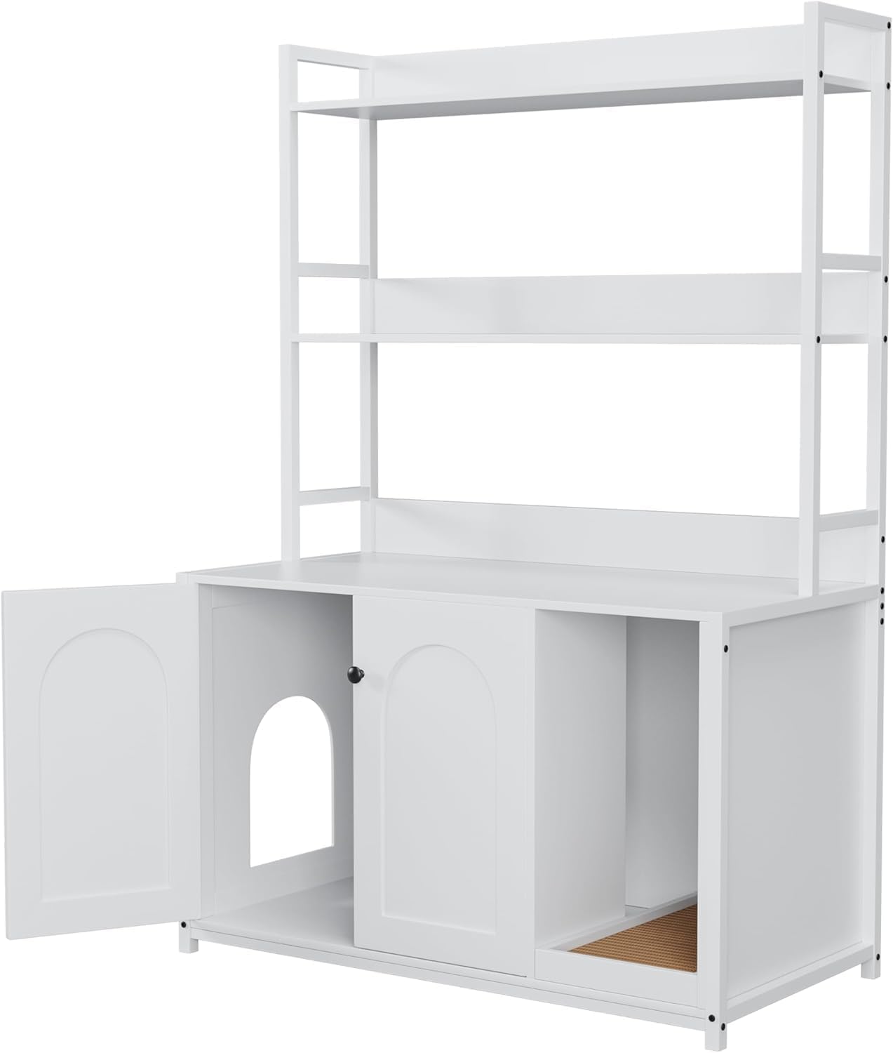 - 😸 Ample Storage Space 😸 Large cat litter box enclosure furniture with two spacious storage shelves offers you plenty of room to organize your pet items. The tabletop can hold up to 110 lbs, provides a secure and sturdy surface so you can confidently place heavy items like cat food, litter, and carrier bags on it. Each storage shelf holds 55 lbs, ideal for lighter necessary cat supplies, including nail clippers, leashes, cans, treats, freeze-dried snacks, , cat grass tablets, etc