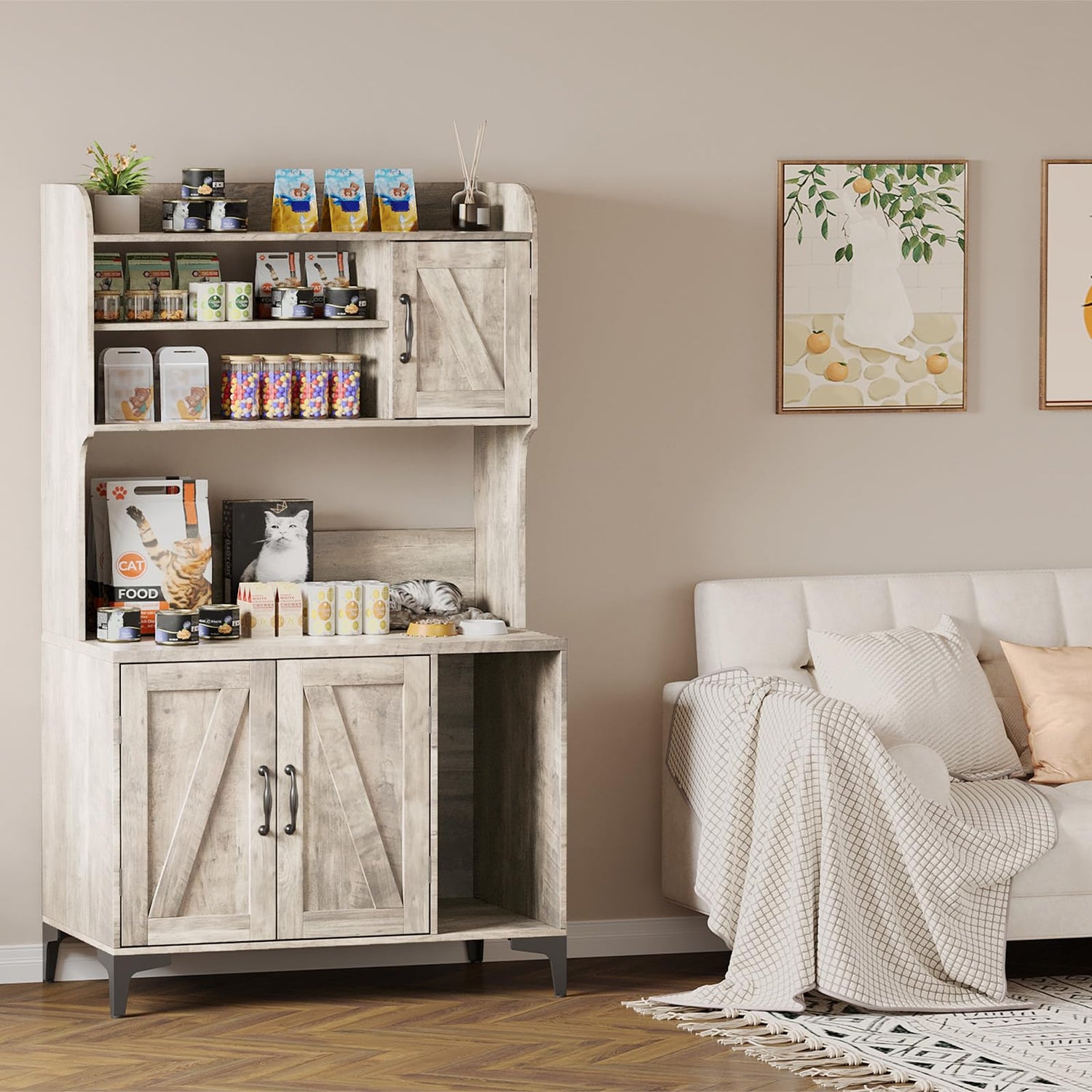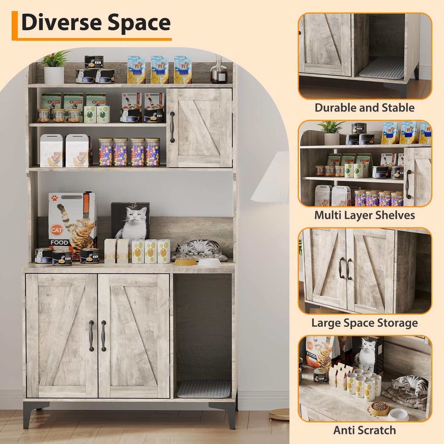 Large Cat Litter Box Enclosure Furniture with 3 Open Shelves and Storage Cabinet, Farmhouse Cat House Washroom with Scratch Pad, Modern Wood Pet House Side End Table for Livingroom Bedroom