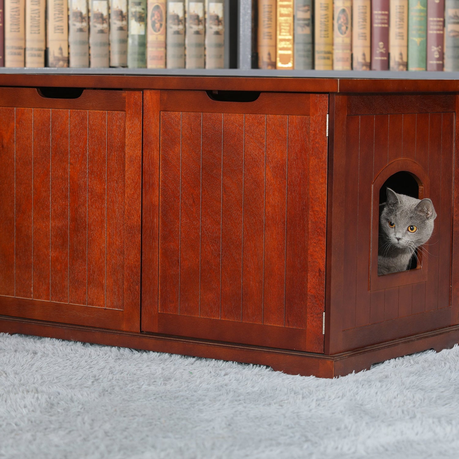 Details: This cat washroom bench serves as an attractive cover to hide away the cat litter box and confines all the litter mess inside, while providing useful space for many organizing options. It is designed to fit any size litter box, including the extra-large automatic litter boxes. It comes with a removable partition wall creating a space to store litter, scoop and other supplies. The entrance to the cat washroom bench can be placed on either side of the unit to suit the room it is used in. Door measurement: 7-inch w by 8-inch h. Minimal assembly required, instructions and hardware are included.