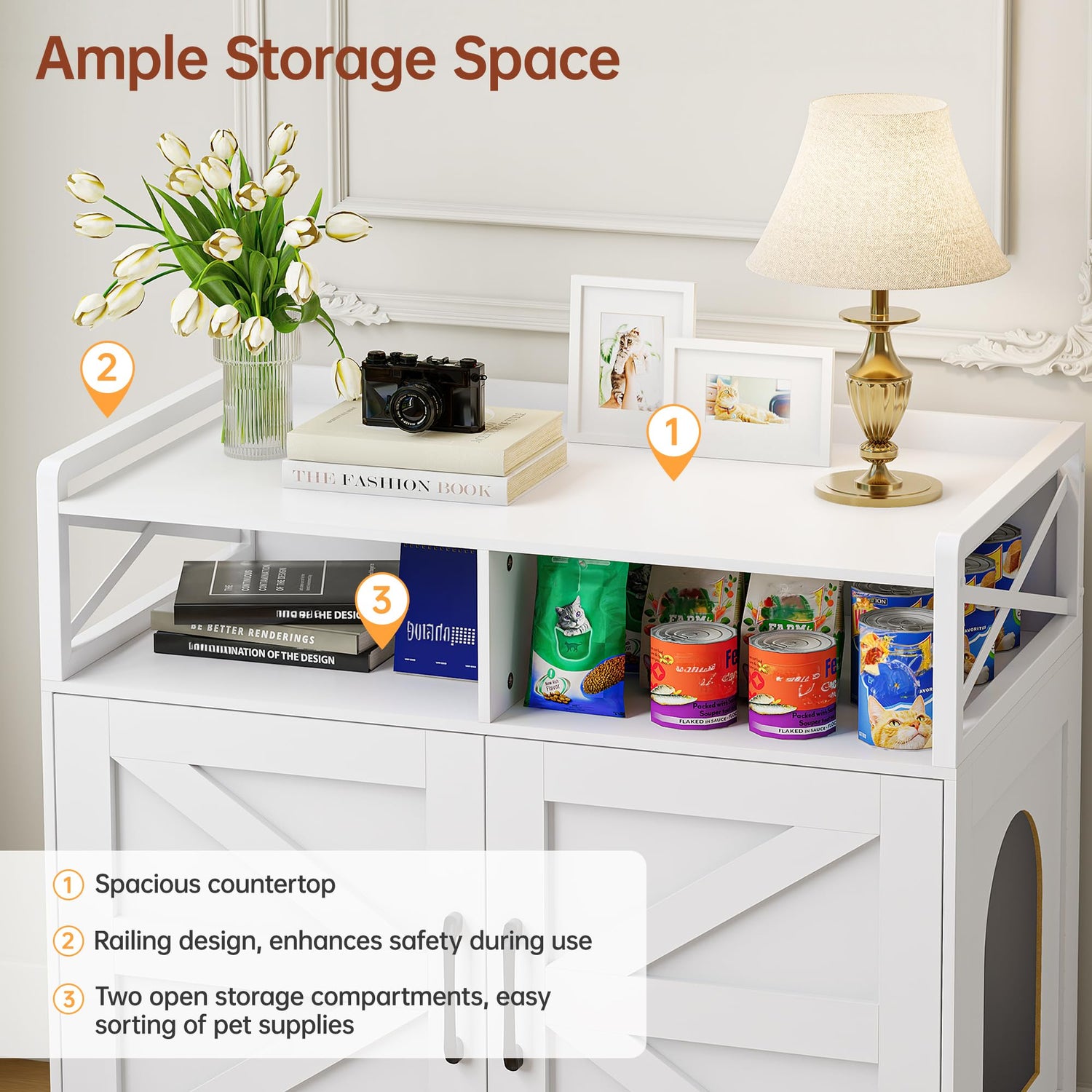 - Ample Storage Space: The litter box furniture includes 2 open storage compartments, facilitating organized and efficient storage of pet supplies. The countertop, enhanced with a railing design, ensures items remain stable and secure, enhancing safety during use.
