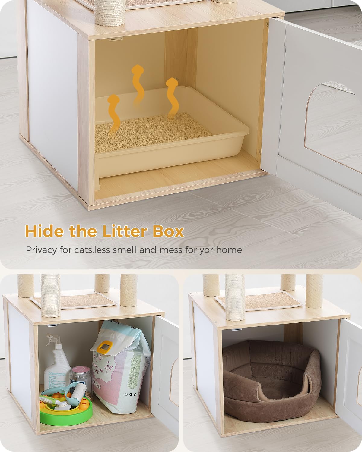 PETEPELA 56.7" Cat Tree with Litter Box Enclosure Large, Wood Cat Tower for Indoor Cats with Storage Cabinet and Cozy Cat Condo, Sisal Covered Scratching Post and Repalcable Dangling Balls, Beige