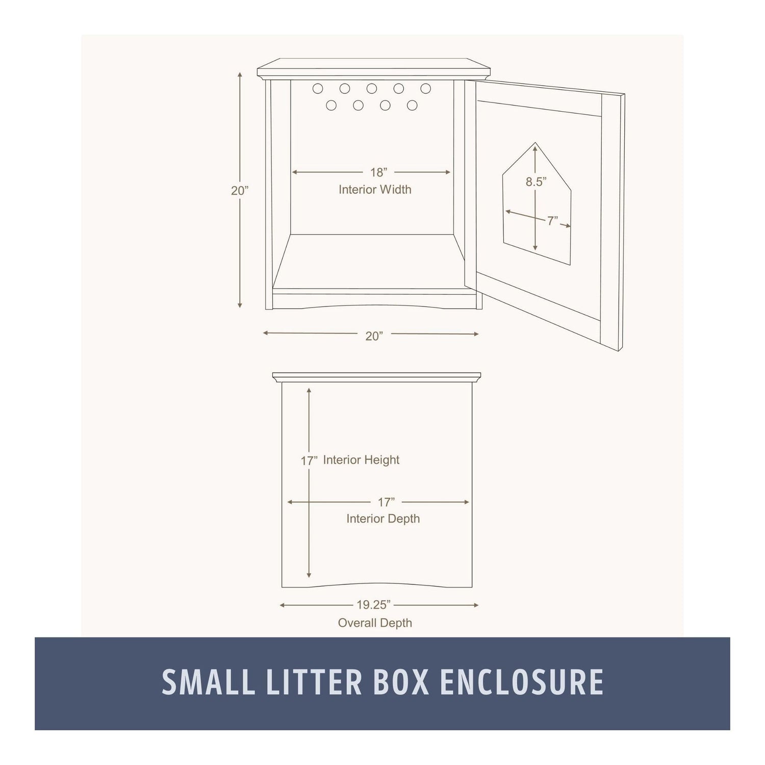 Details: The TRIXIE Litter Box Enclosure will provide your feline all the privacy they desire as they do their business. Use it to conceal your litter box or as a cat house providing a comfortable place to call their own. Place in any room of your house, it will be great as a side table or nightstand. The cabinet holds up to 50 pounds so place a lamp, potted plant, or decorative accents on top to give your room character. Overall dimensions: 19.25 x 20 x 20 inches. Interior dimensions: 17 D x 18 W x 17 H-inches Litter box and bed are not included.