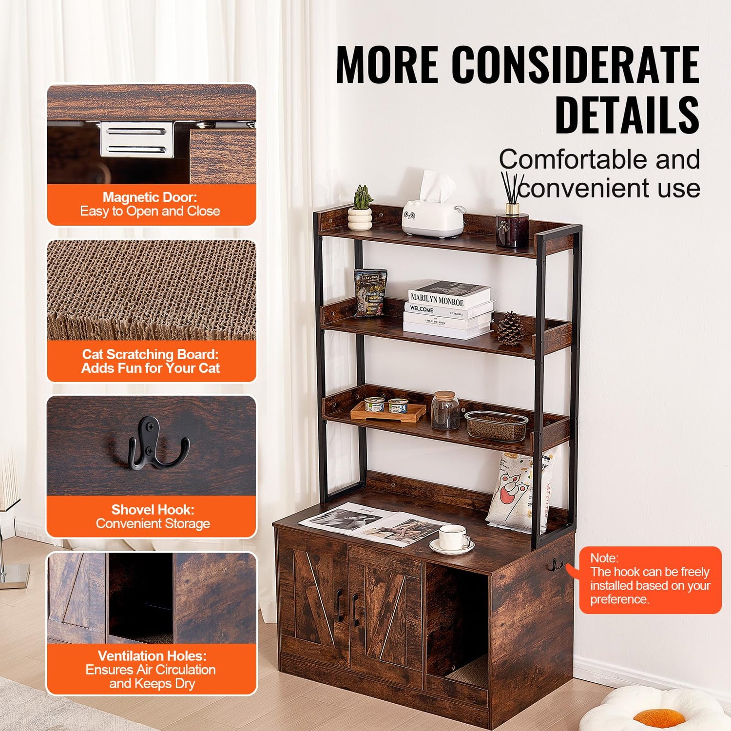 VEVOR Cat Litter Box Enclosure, Hidden Litter Box Furniture with 3 Storage Shelves, Wooden Cat Washroom Indoor, Large Cat House Cabinet Hidden Fit Most Litter Box, 33.5"L x 19.3"W x 58.7"H, Dark Brown