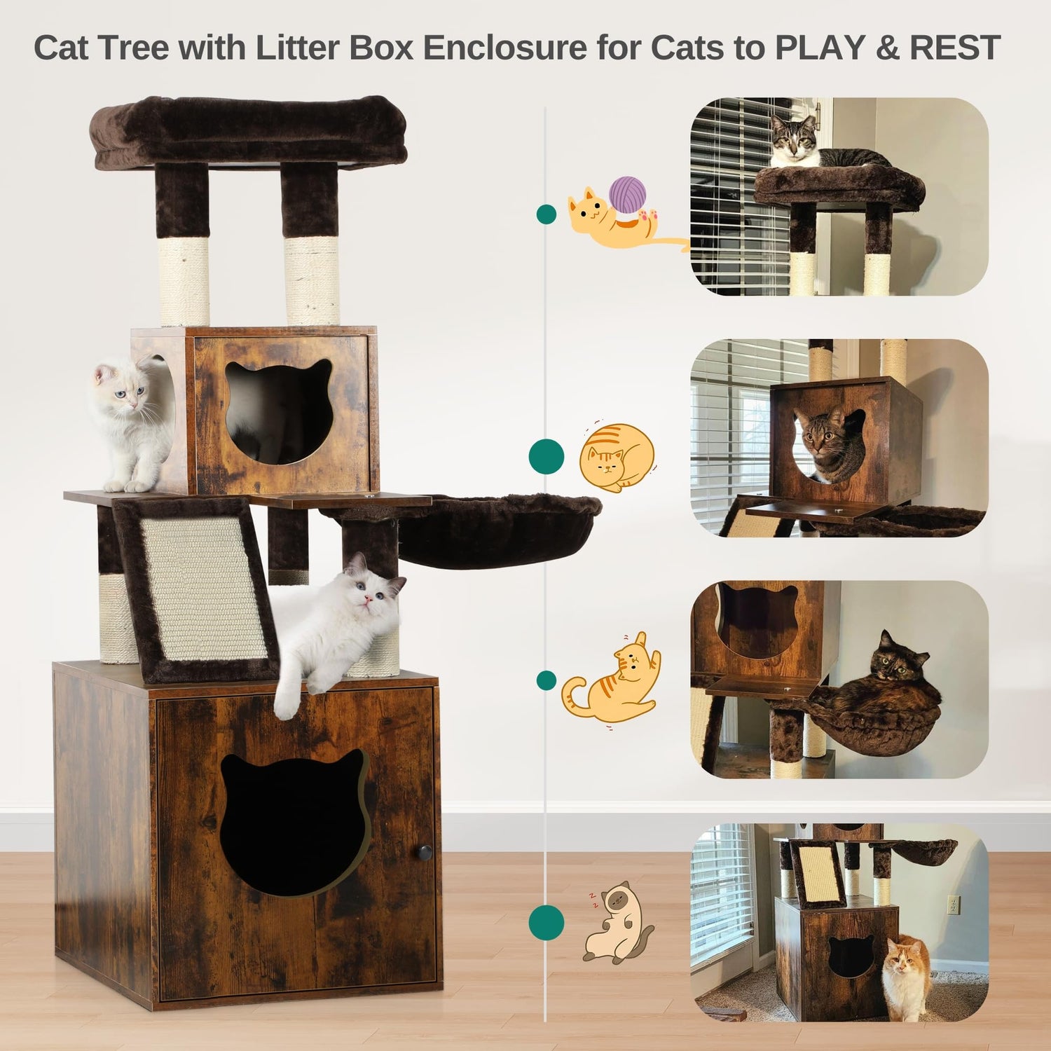 - 2-in-1 Cat Condo: Merge the cat tree and litter box enclosure to facilitate your pet's exploration, resting, playing, and potty tendencies all in one place