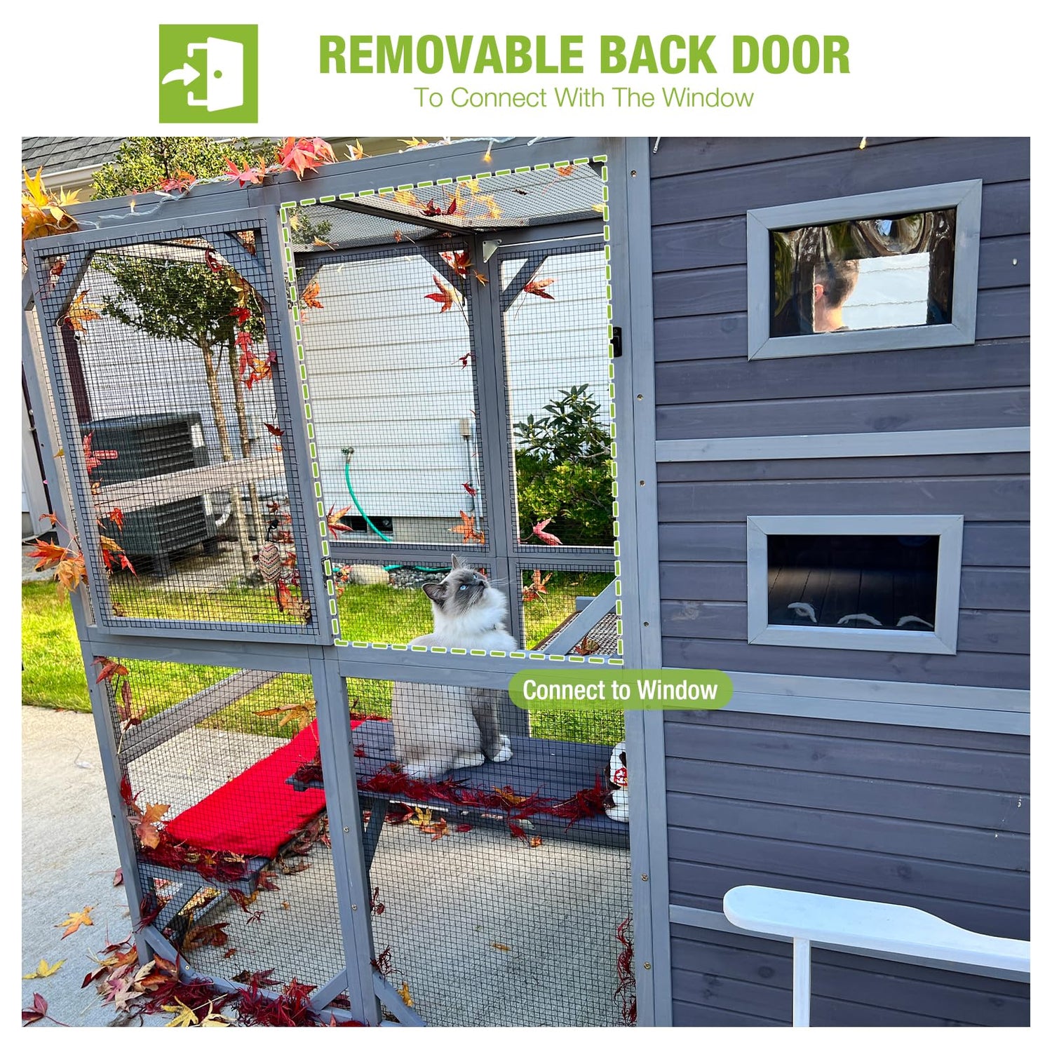 - š½ćWindow Cat KennelćA removable back door allows you to connect the cage to the window. Keep cats safe in and out. The height from window to ground is 35.6".