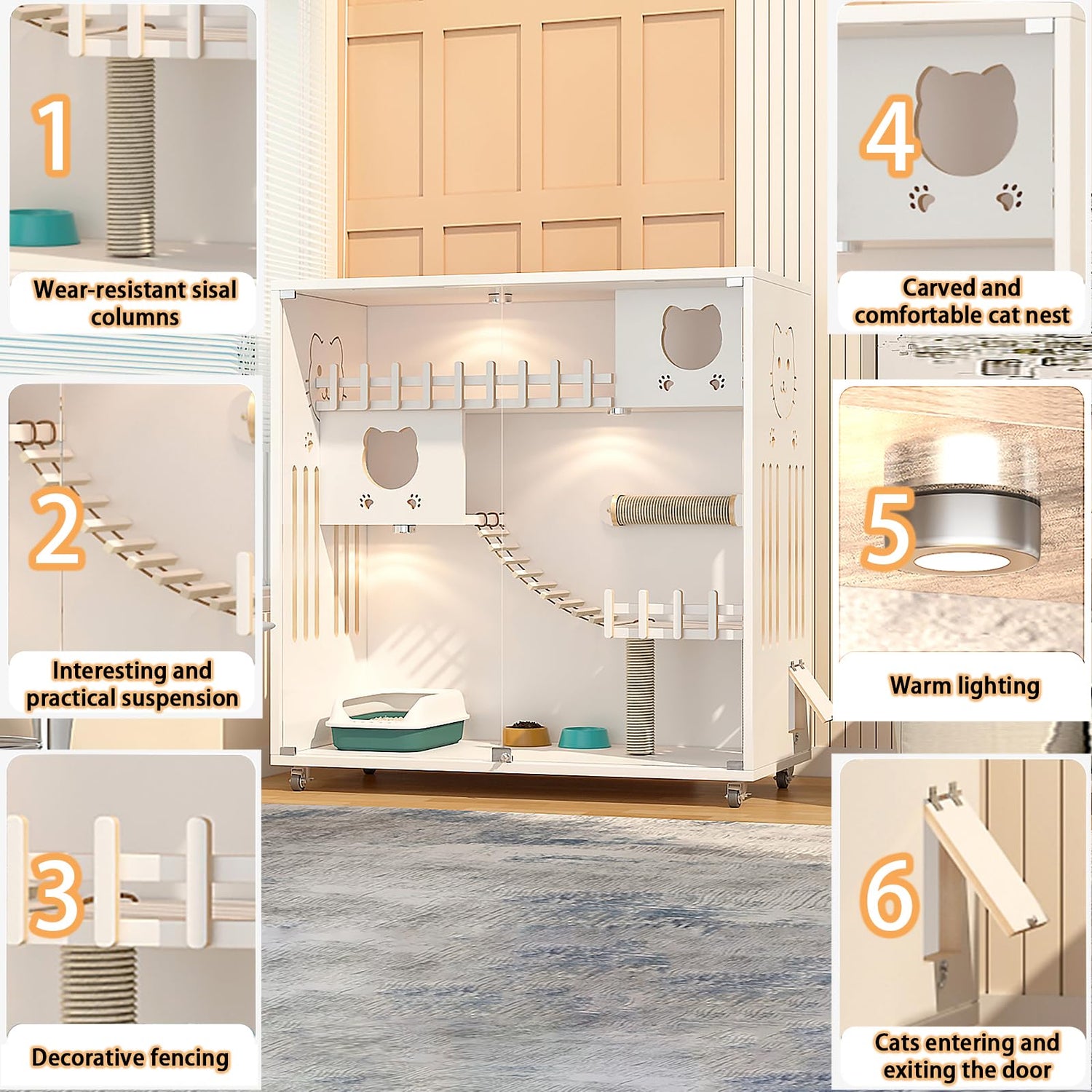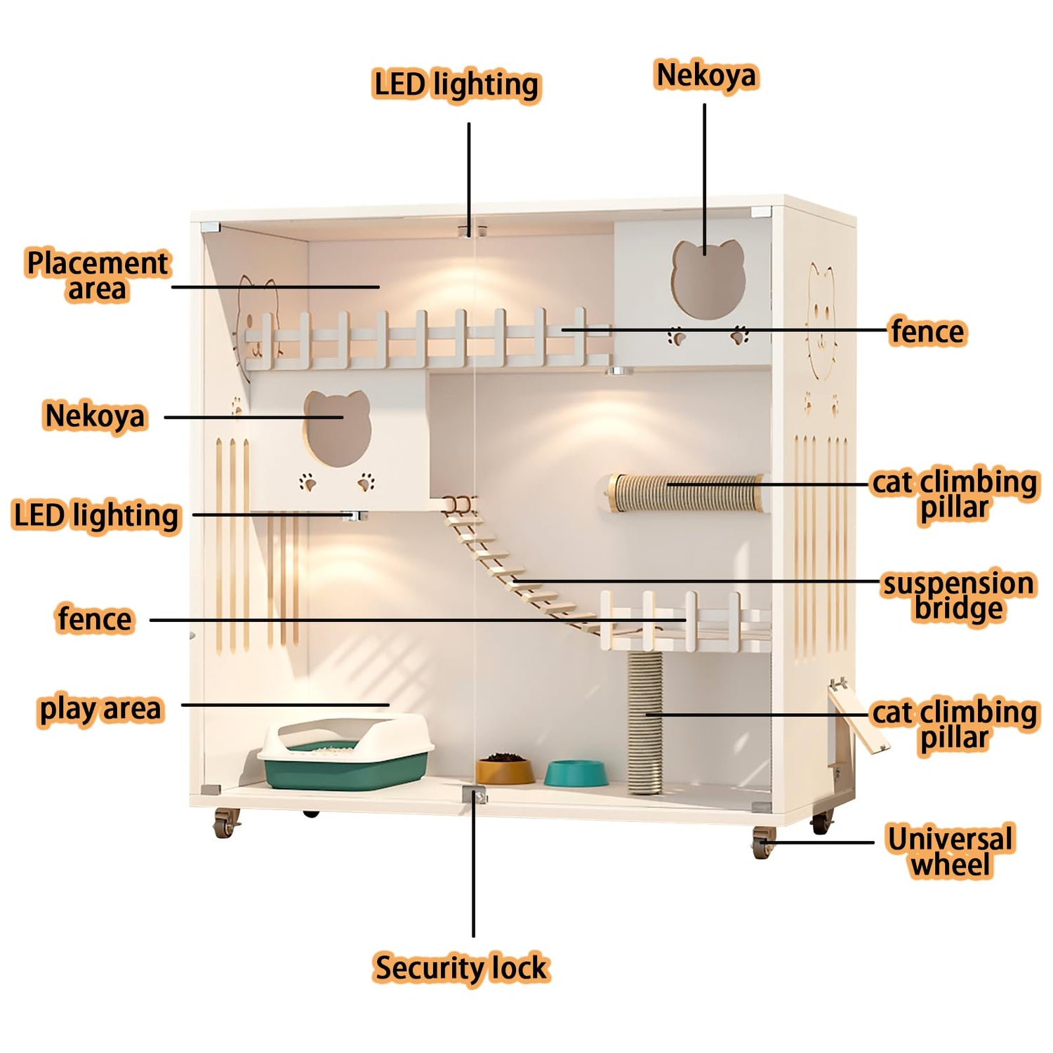 • 😸 【Large Cat House】 The size of this wooden cat house is 50*48*24 inches,it can hold a number of items such as a litter tray, water feeder and toys. Wooden cat house can be placed anywhere in the room, such as living room, bedroom, etc. Allow you to see your cat's activity at night, we have installed led lights in the ceiling of the house to provide illumination.