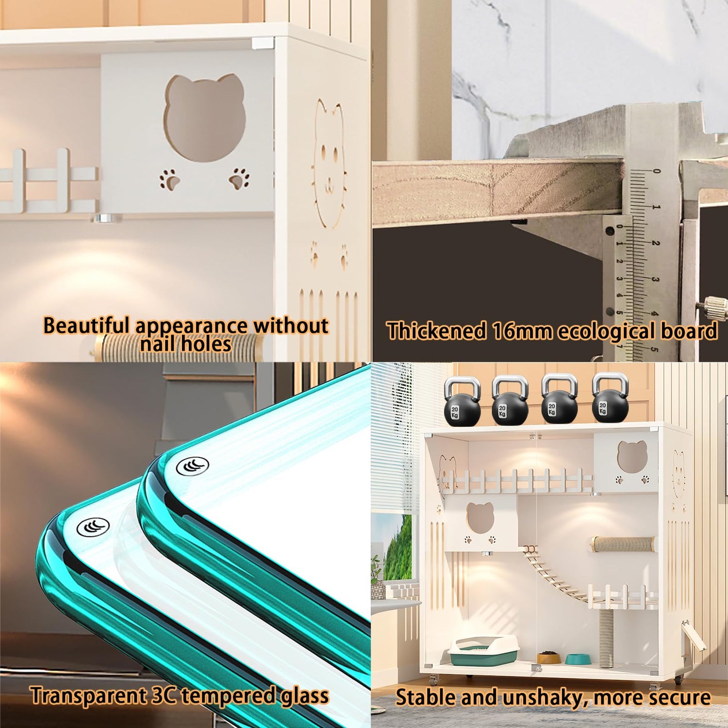 • 😸【Diverse Functionality & Glass Door】 The door of the cat condo is made of glass material, high-definition, transparent, allowing you to observe the cat;spacious space is comfortable and breathable, allowing your cat to move easily;2 escape doors provide pets a sense of security,At the same time, we also provide funny cat sticks and cat mats so that your pet can have fun.
