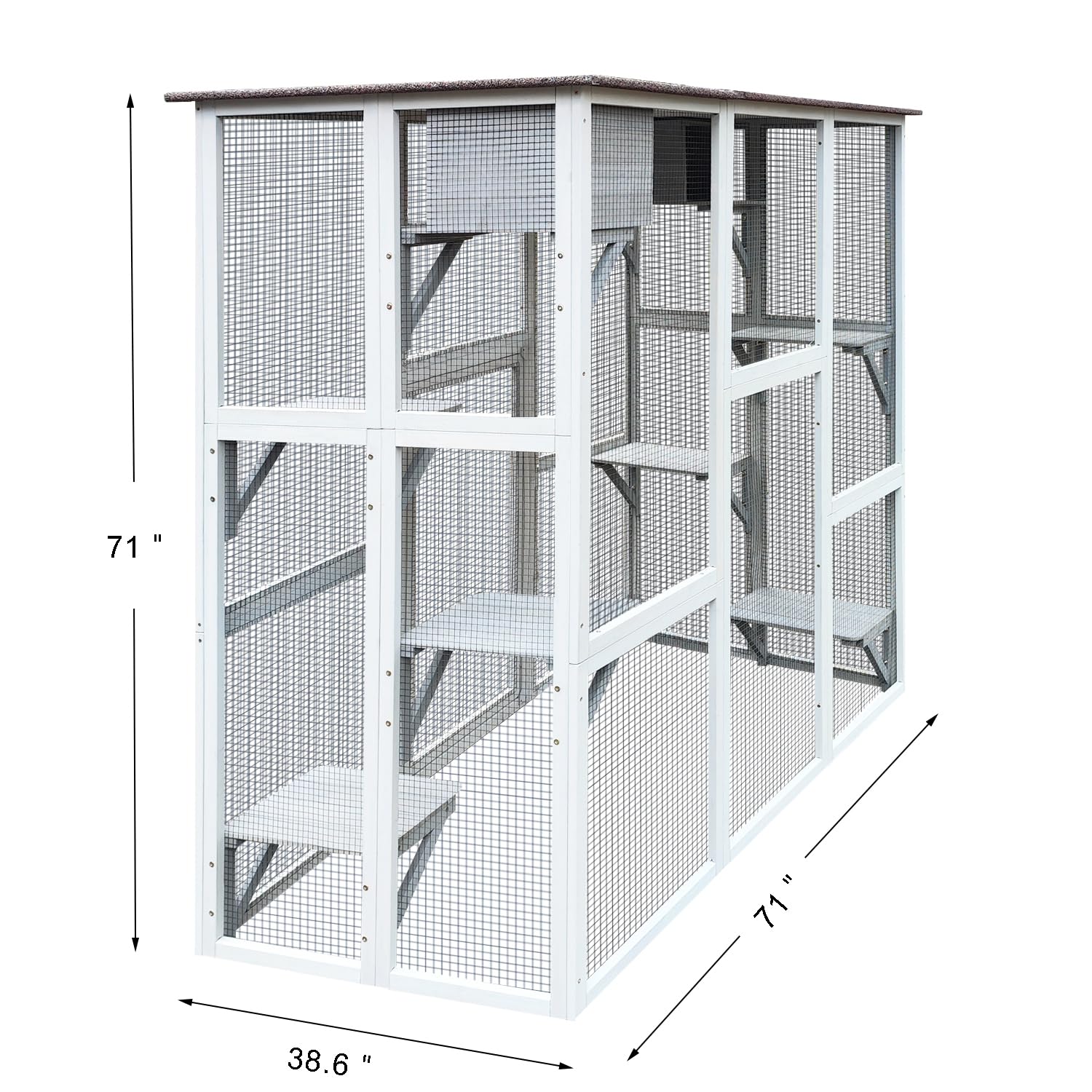 KELRIA 71 Inch Wooden Catio Outdoor Cat Enclosure, Large Cat House with 8 Jumping Platforms, 2 Napping Houses & Weatherproof Asphalt Roof, Walk-in Kitty Condo Shelter Playpen for Multiple Pets, White