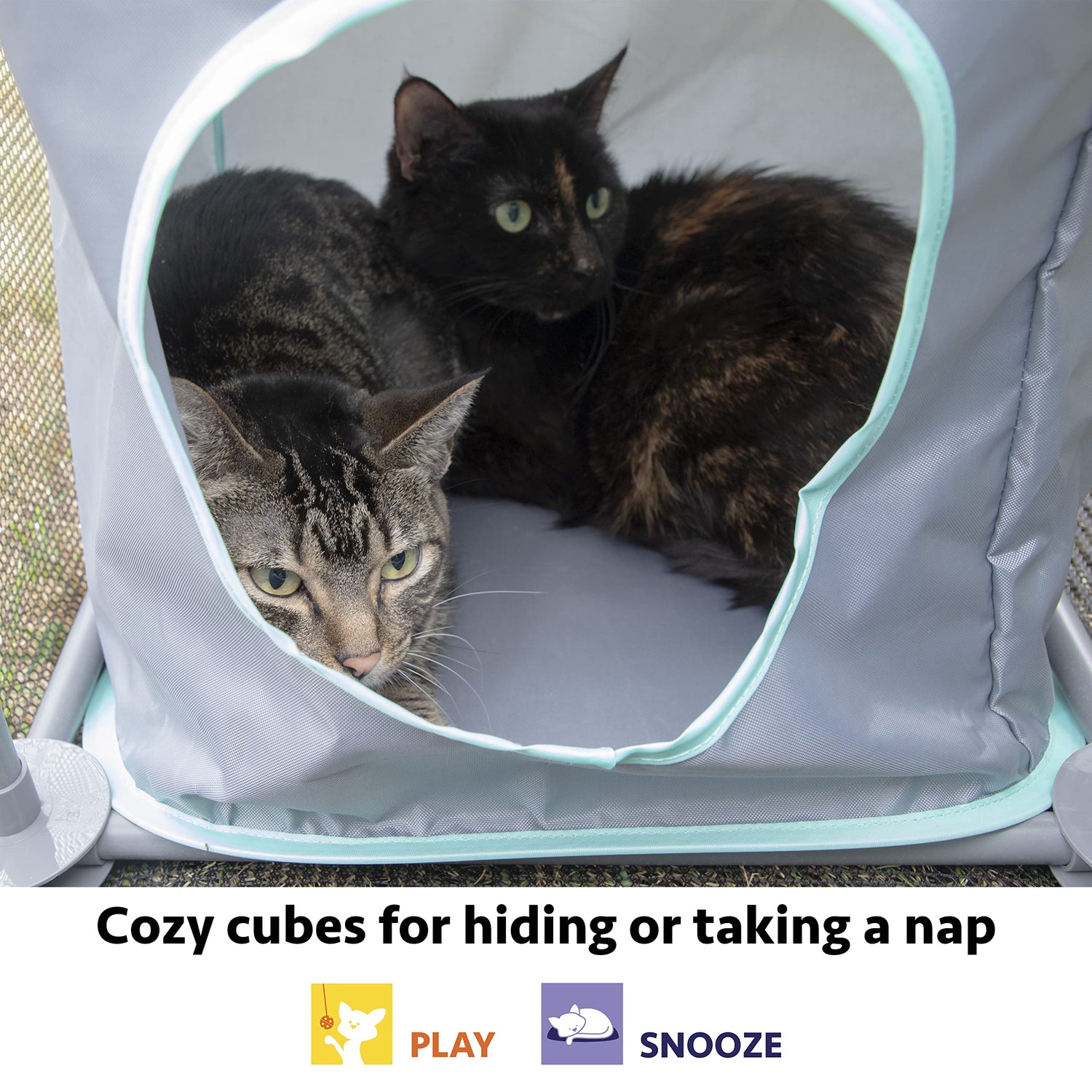 - SPOTS TO HIDE AND SNOOZE: Included cubby cubes are rearrangeable inside the structure, giving you plenty of ways to keep your cats engaged by mixing it up over time. Each is a perfect spot to curl up and get away from the action.