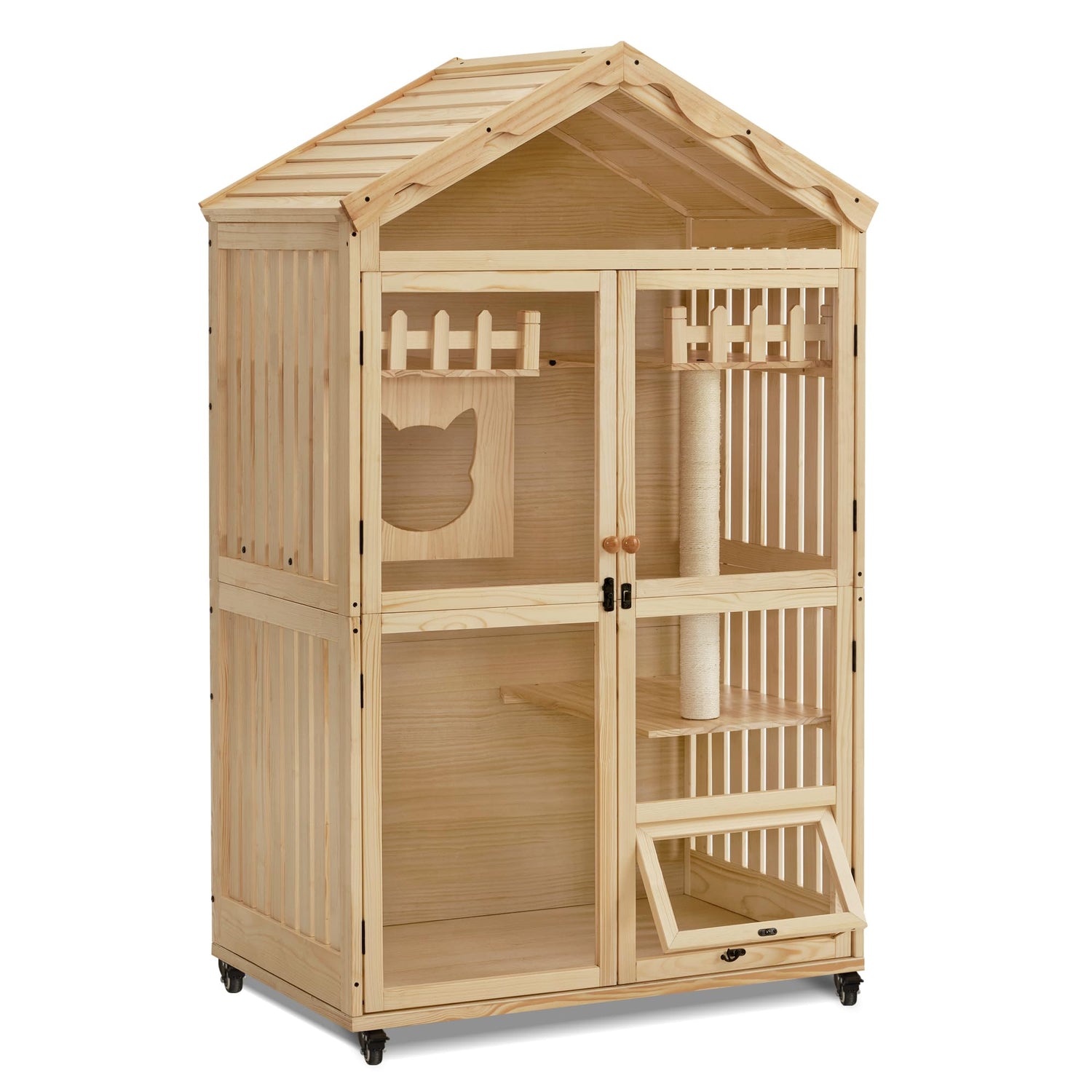 MCombo Wooden Cat House for Indoor Cats, Cat Villa with Cat Entrance, Cat Catio with Lockable Doors & Wheels, CT291