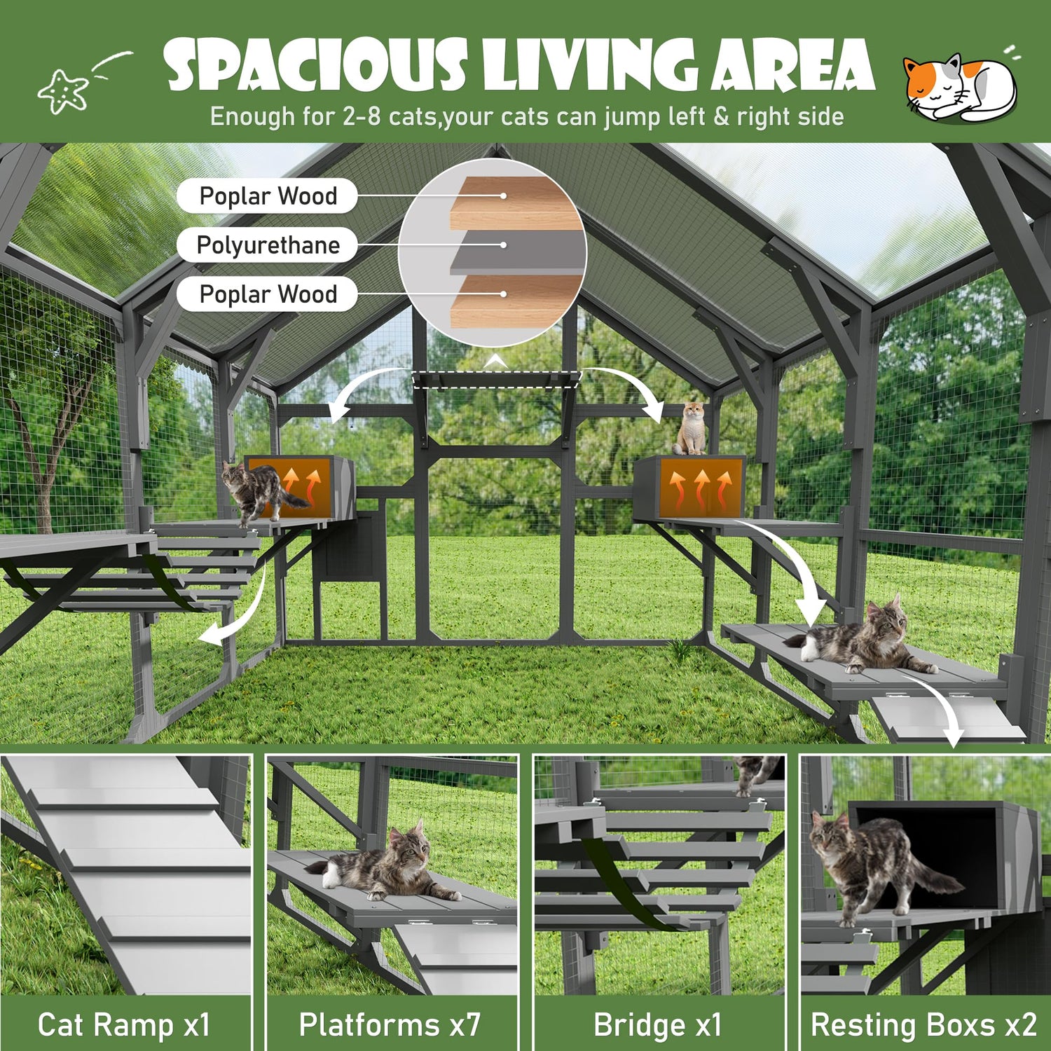 - Convenient Walk-In Design: Our spacious cattery comes with a 74.4-inch-tall entrance door and a smaller door for effortless feeding and cleaning. The easy access ensures your cat can enjoy pleasant interactions and explore nature safely.