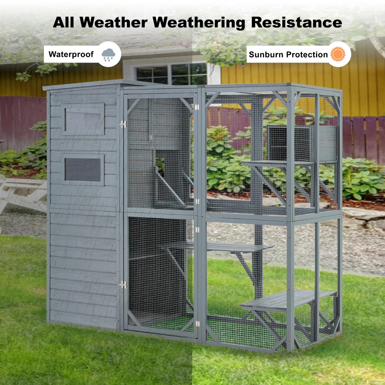 Mxsunh Catio Outdoor Cat Enclosure Large Weatherproof Outdoor Cat House for Outdoor Cats with 3 Resting Boxes, 3 Platforms,5 Windows,70" H*32" W*77" L-Gery