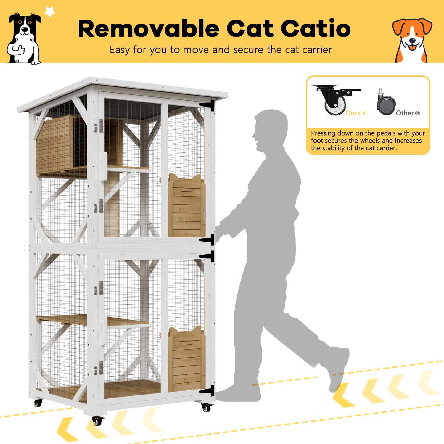 OFIKA Cat House Catio Outdoor Enclosure with Waterproof Roof,71'' cat House & Condos on Wheels for Outdoor Patio,Cat Window Box,Scratching Post(White)