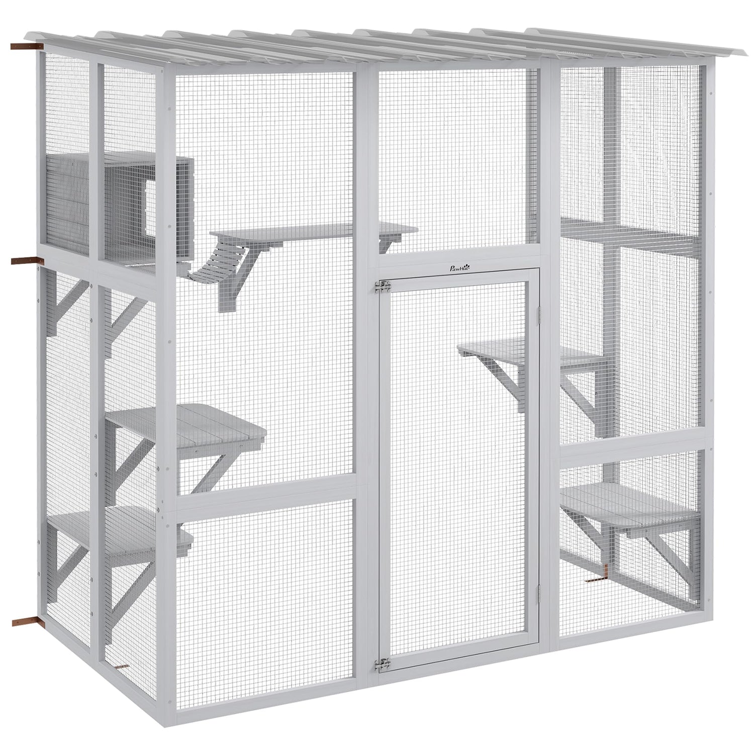 PawHut Catio Outdoor Cat Enclosure, Large Cat House, Wooden Cat Window Box with Scratching Posts, Weather Protection Roof for 1-2 Kitties, Resting Boxes, 68" x 35.5" x 70.5", White