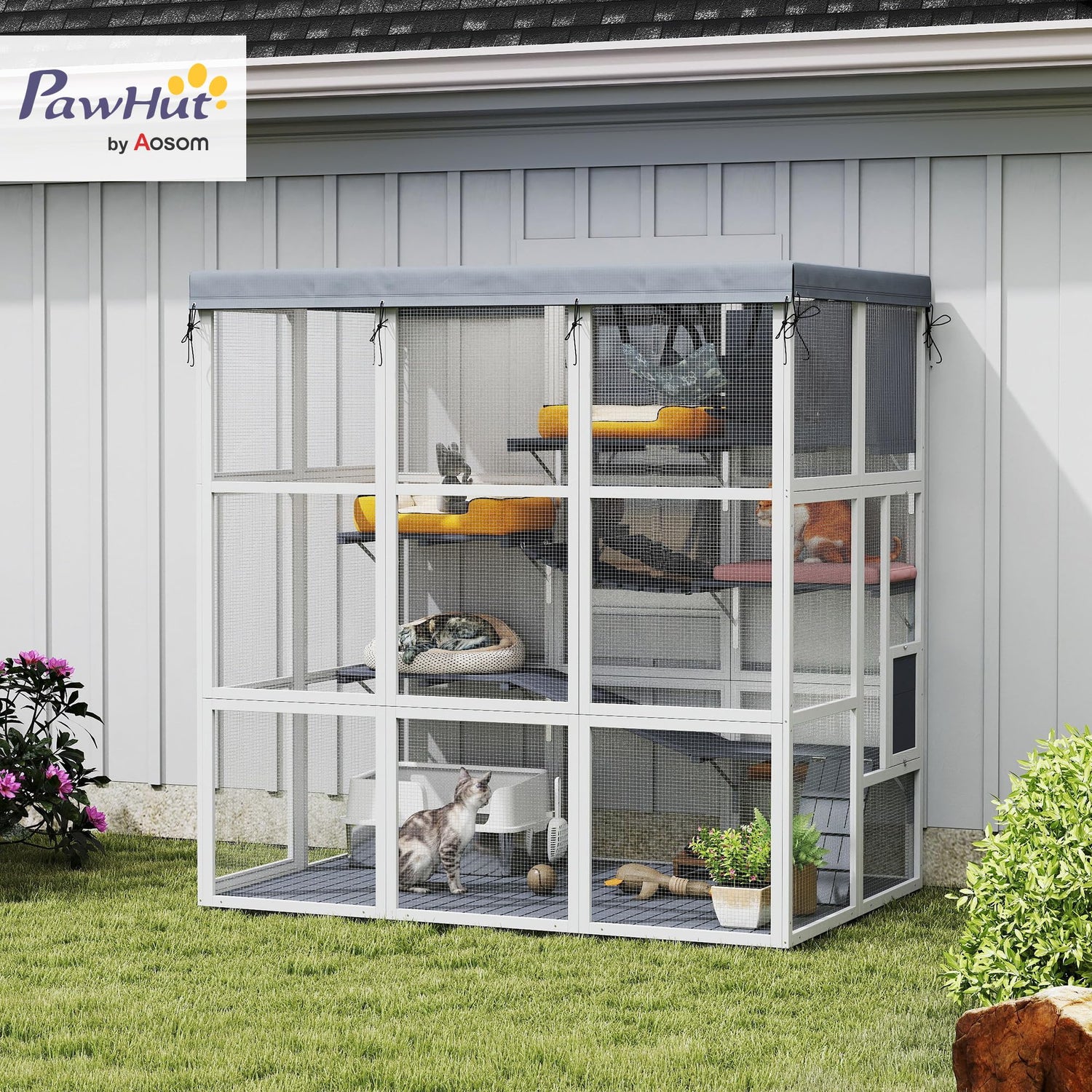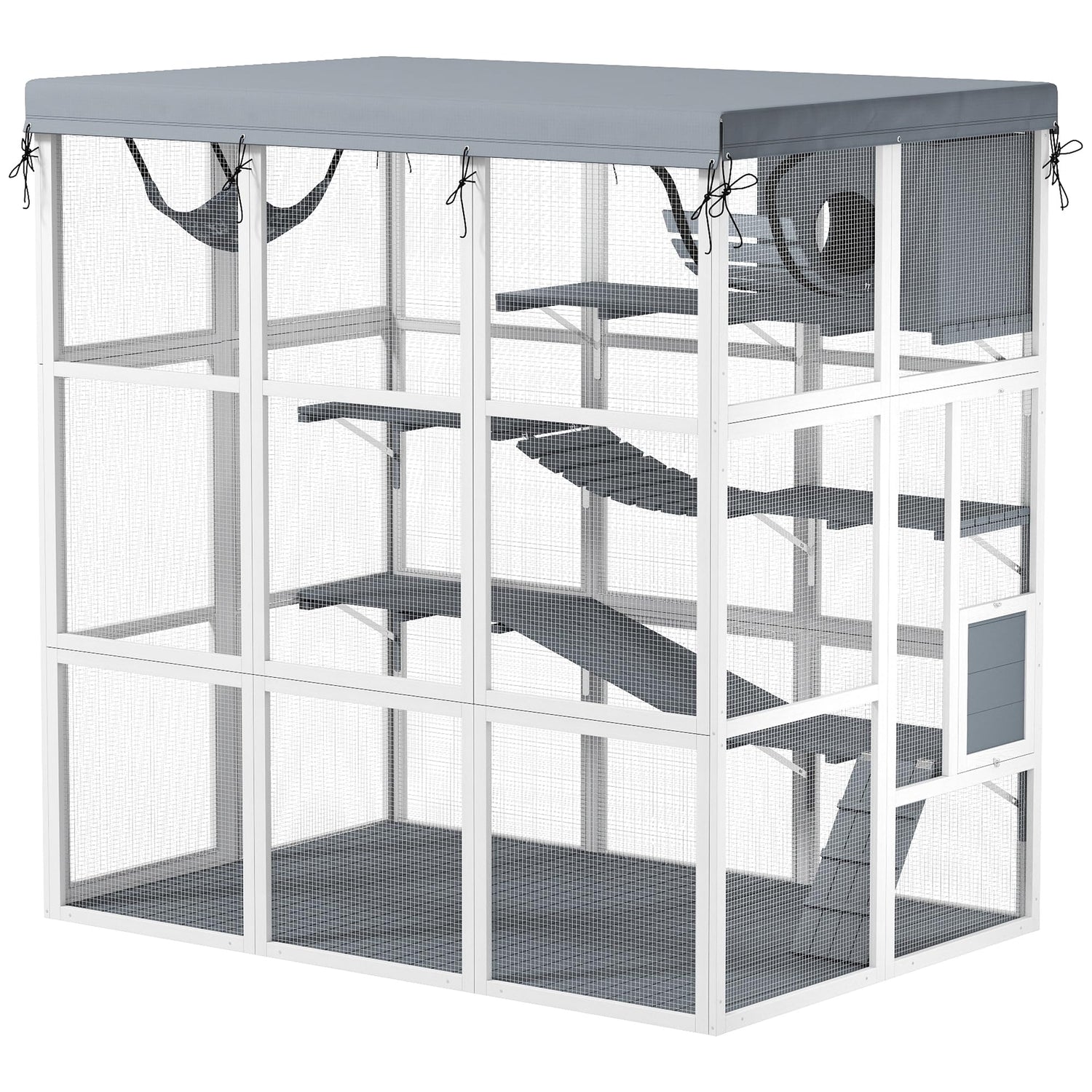 PawHut Catio Outdoor Cat Enclosure, Large Luxury Cat House Outside with Hammock, Condo, Jump Platforms, Ladders, Ramps, Tarp, Walk in Cat Cage for 2-4 Large Cats, 71"