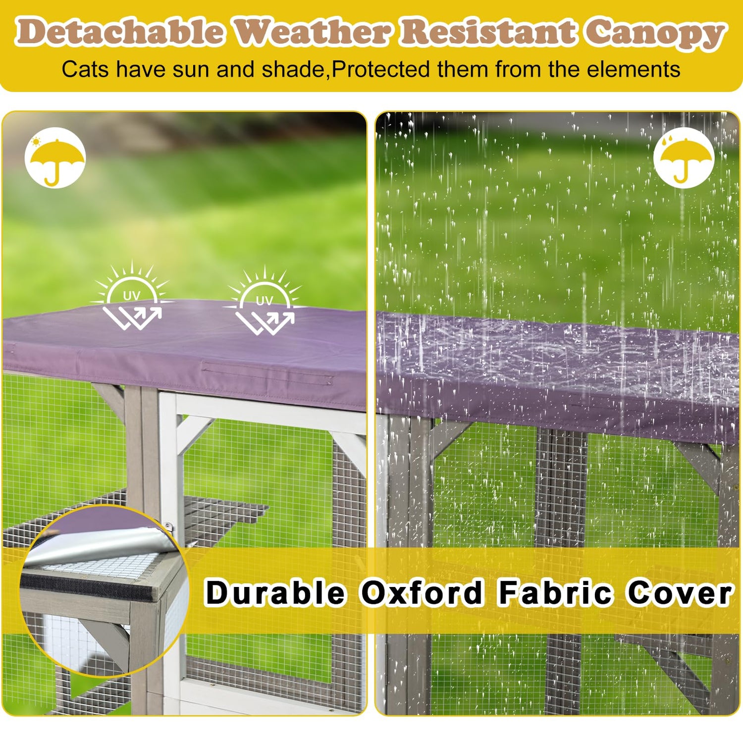 - Removable Sun and Water Roof:Unlike traditional asphalt roof,our cat cage can be use without roof,allows your cat to soak up the sun.You can also cover the waterproof cannopy,that ensure your cats stay outside enjoying the fresh air,don't worry rainy suddenly or sunset.