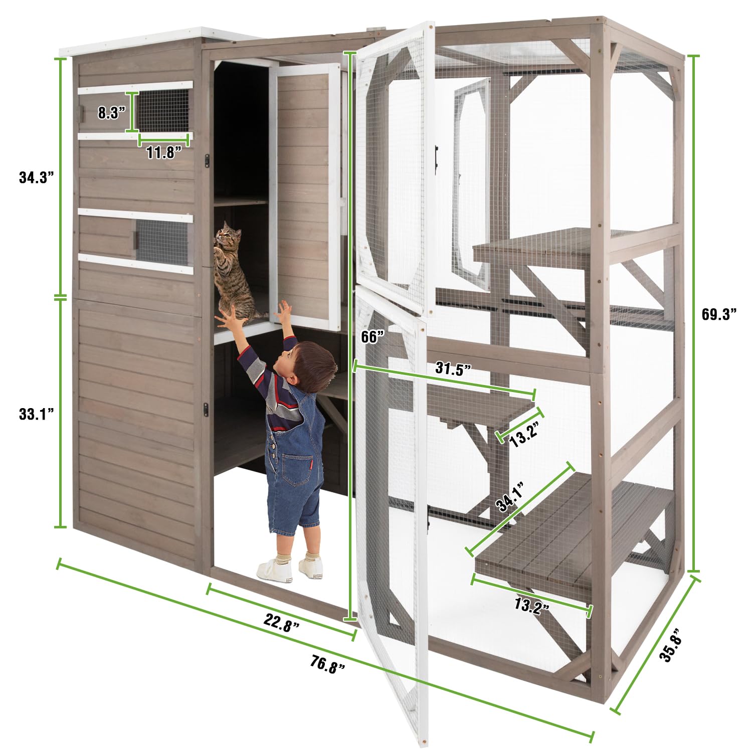 - Stable Large Cat Cage: Cat houses oversize 35.8"L x 76.8"W x 77.4"H,main doors Height: 66",allowing adult people or chubby cats to access the cat enclosure.Each coners have wooden strips to reinforce,the catio is sturdy and durable for long term use.
