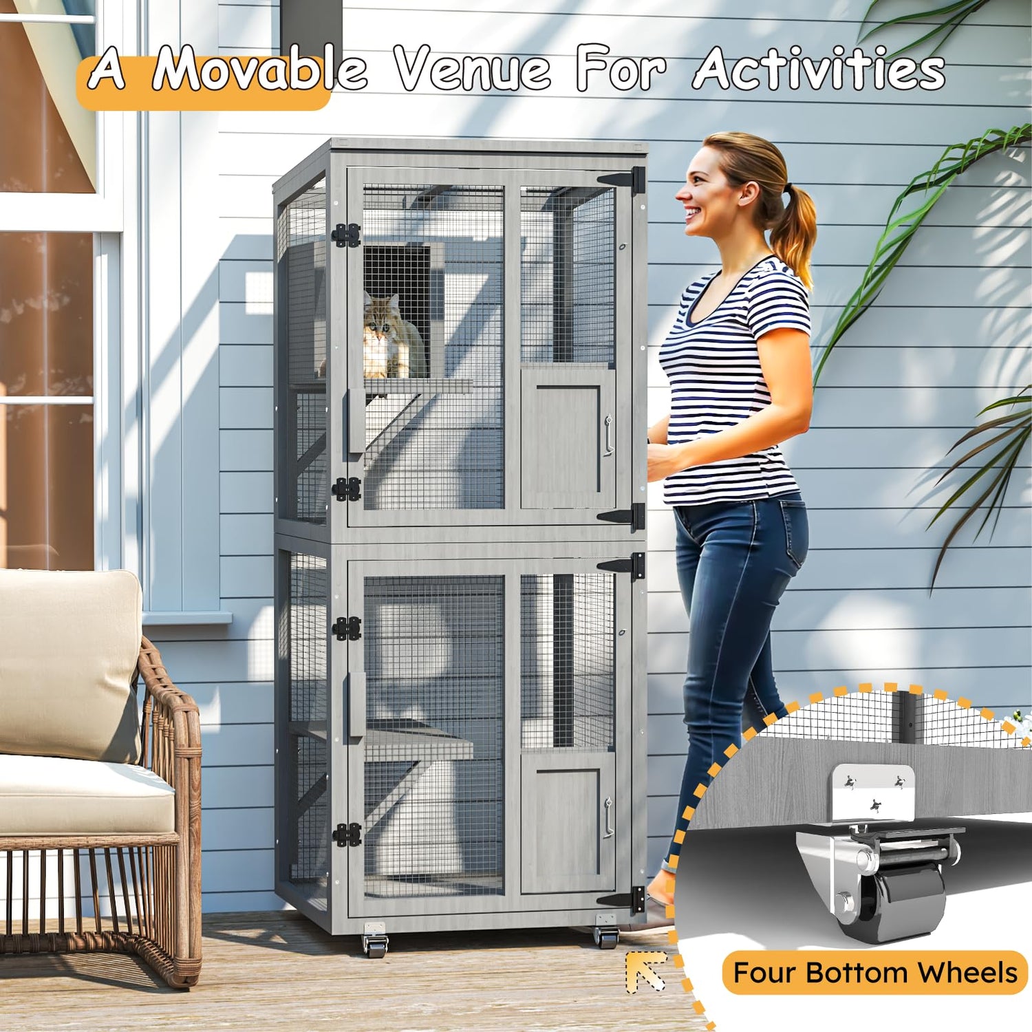 • Mobile Cat Palace: Equipped with 4 smooth universal wheels, this indoor/outdoor dual-purpose cat paradise can easily travel between room and garden. Easily accommodates multiple cats when pieced together - the ideal cat hotel for multi-pet families. Instantly create a patio cat hotel or transform into an indoor cat residence - mobility and luxury at the same time!