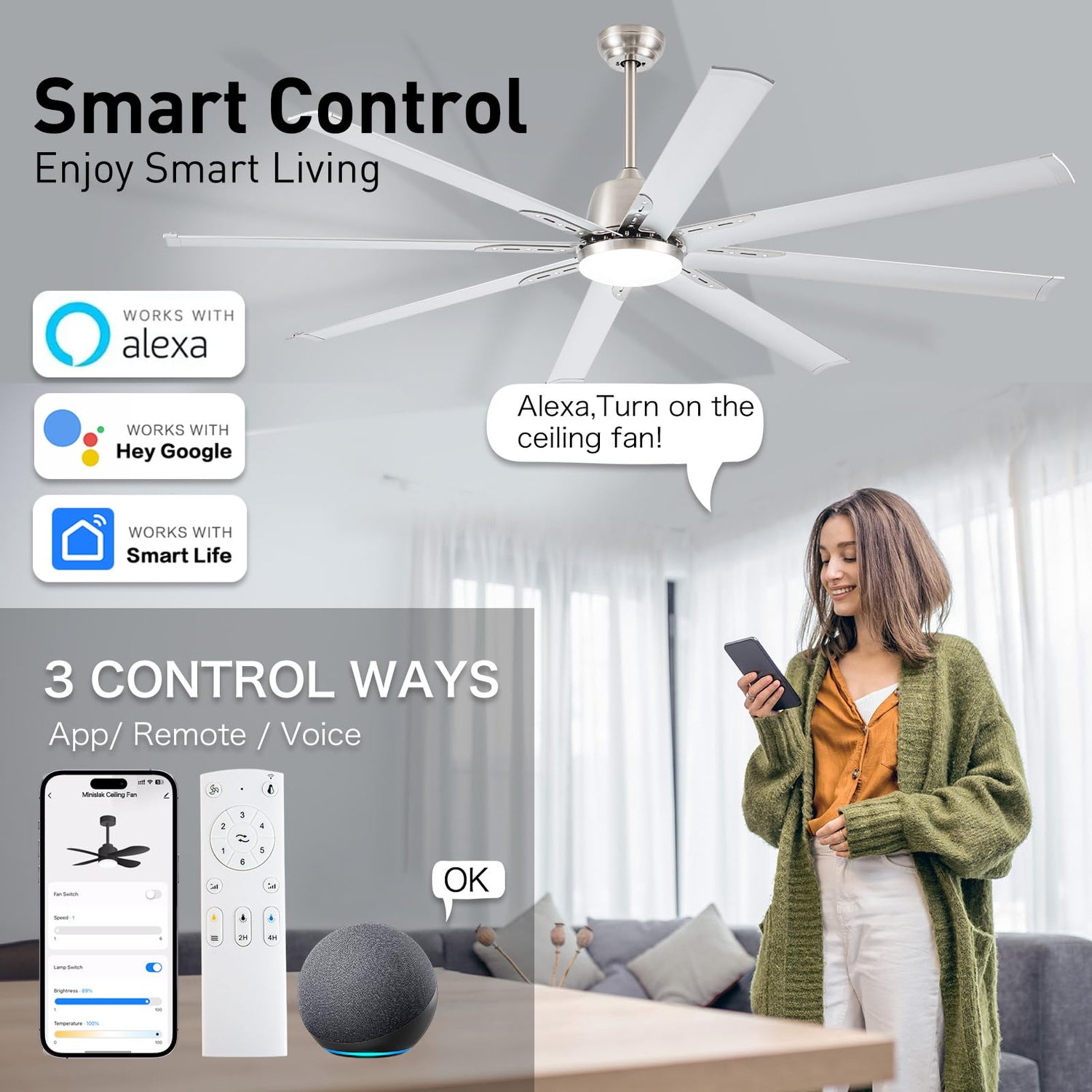 72 lnch lndustrial Smart Celing Fan with Light and Remote Control via WIFI Alexa,Large Celing Fan with 8 Brushed Nickel Aluminum Blades,6 Speed Noiseless DC Motor Indoor Outdoor Ceiling Fans for Patio