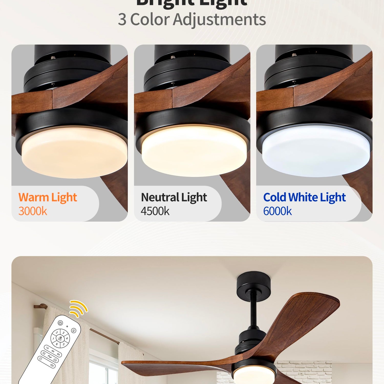 - đăMulti-speed Reversible Fan MotorăUtilizing a 35W DC motor for 200r/min in full speed model, operates at less than 30 db, making it a quiet fan for bedroom . you can easily switch between forward and reverse functions and choose from 6 speeds, LED light 3000K warm white light, 1500 Lumen, 15W.