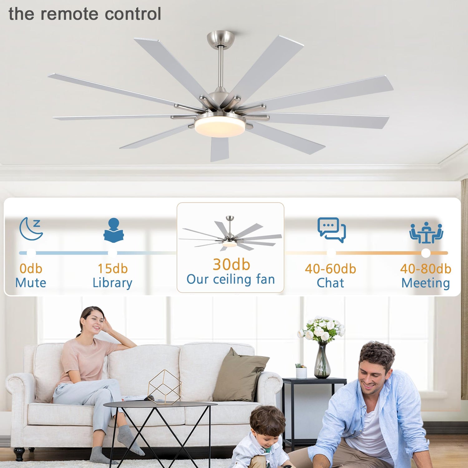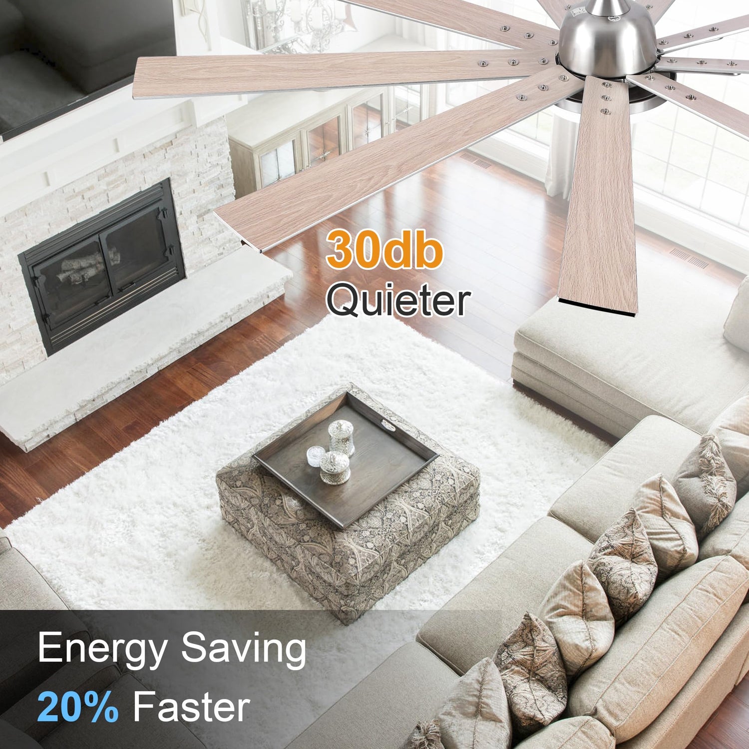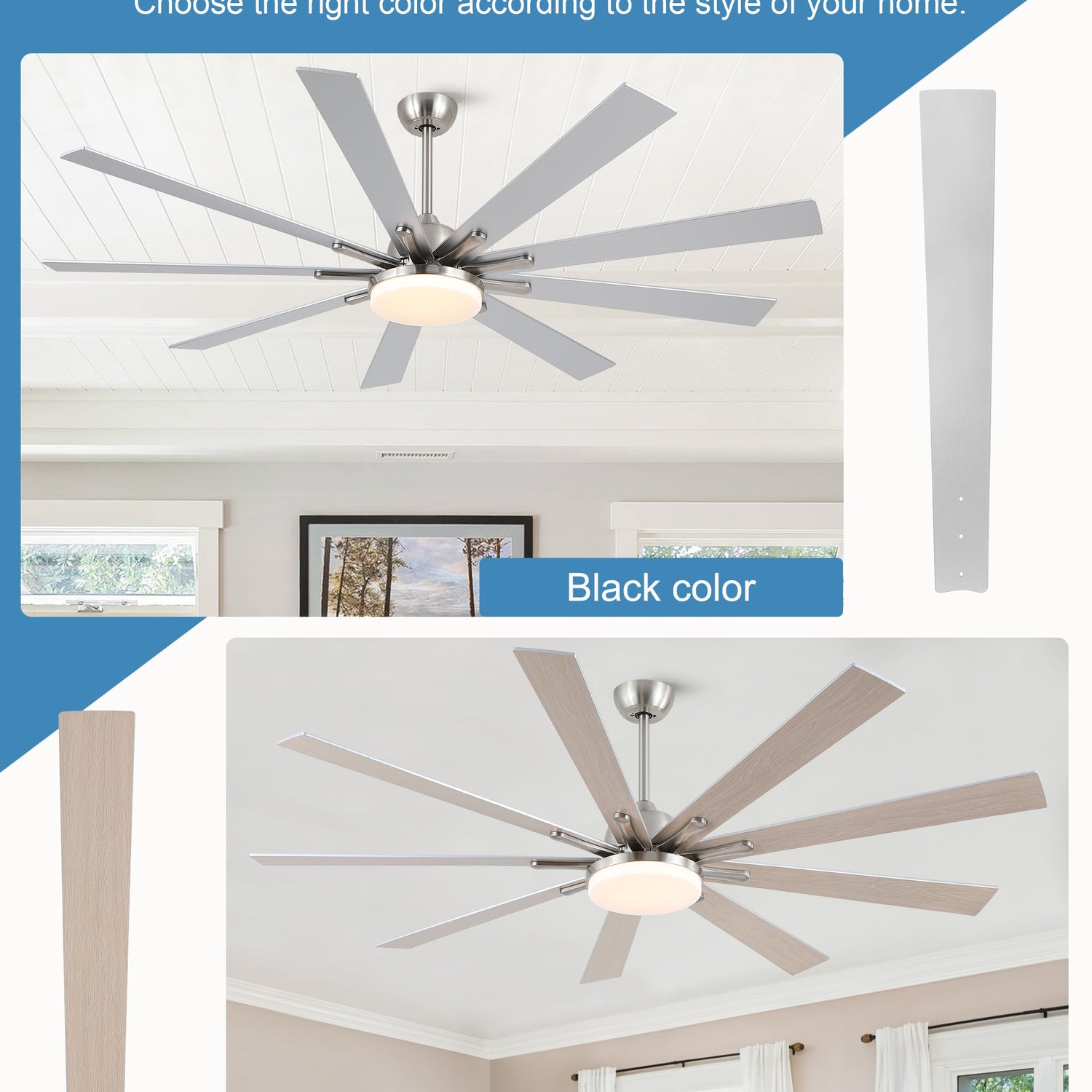 POCHFAN 72 inch Ceiling Fans with Lights and Remote, Large Ceiling fan with 9 Wooden Blades for Kitchen Living Room Indoor or outdoor Patio,Quiet 3 CCT,6 Speed, Brushed Nickel