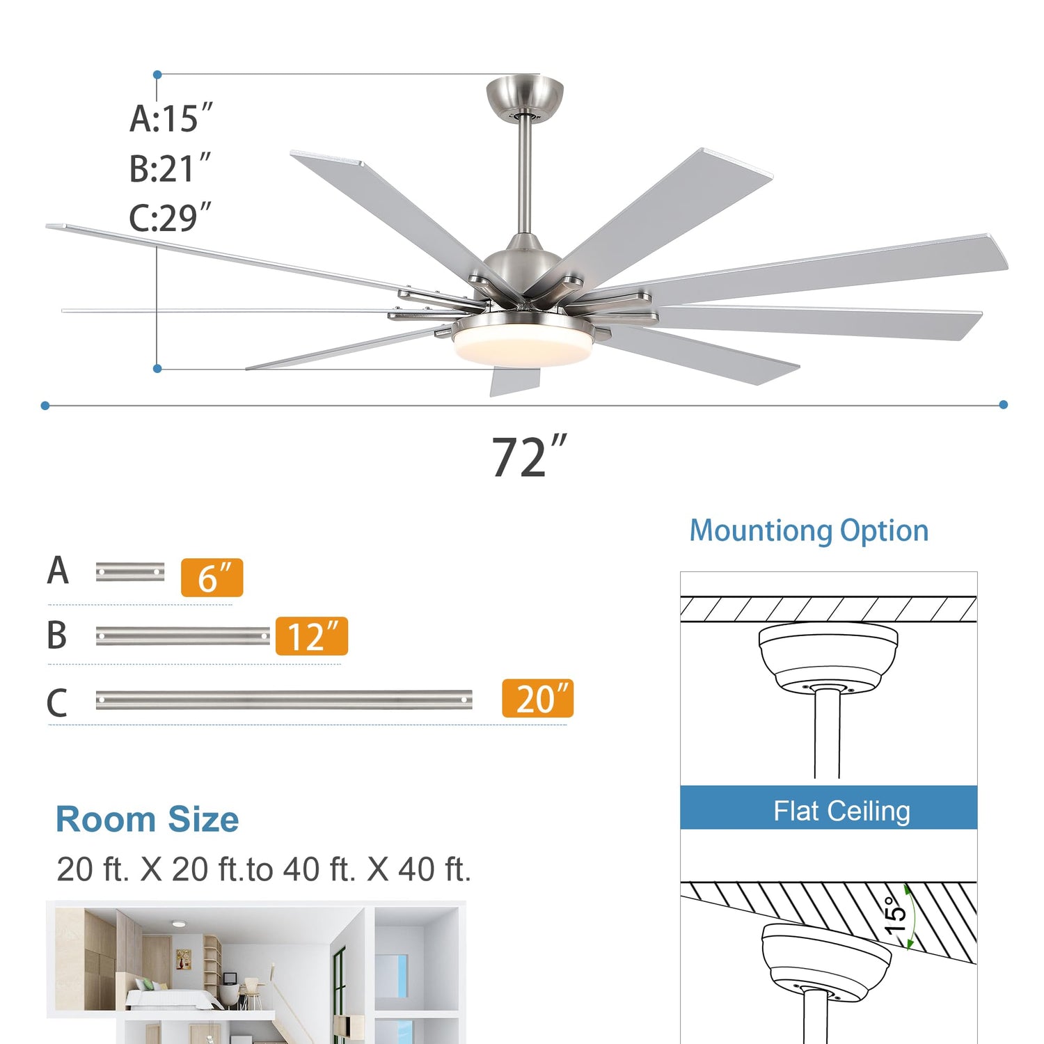 - 72 Inch Ceiling Fan: This large ceiling fan includes 6", 12", and 20" down rods, suitable for different ceiling heights. The blades are made of thickened engineering wood, double-sided wooden blades (nickel and wood color), the body is made of thickened metal material,the appearance perfectly blends modern and farmhouse styles, and the design of 9 blades makes the air volume larger and smoother, replacing the need for multiple smaller ceiling fans. Ideal for living room, garage, barn, or covered patio