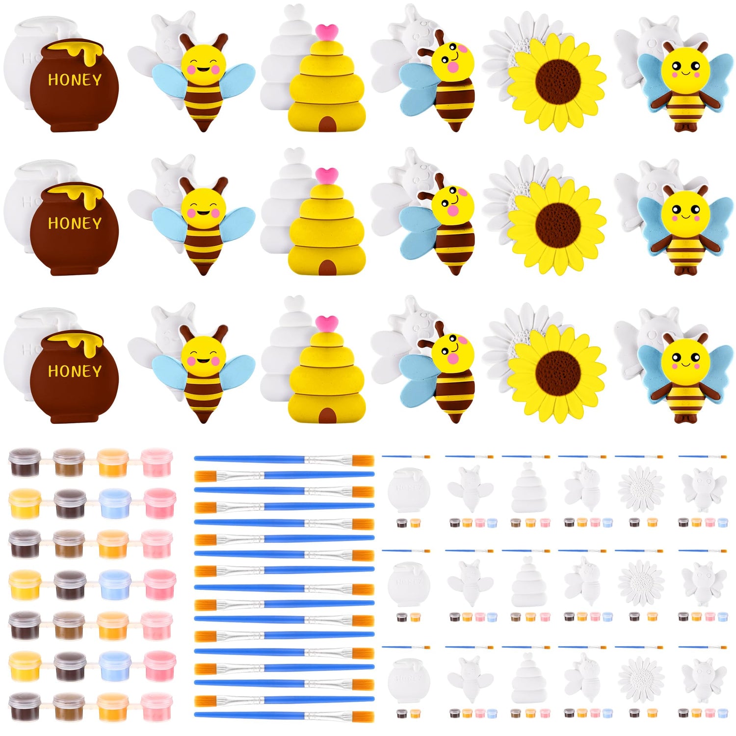 Geelin 18 Set Bee DIY Painting Kit Summer Ceramic to Paint Your Own Bee Statues Unpainted Plaster Figurines Brushes Acrylic Paints Bags Party Favor for Adults
